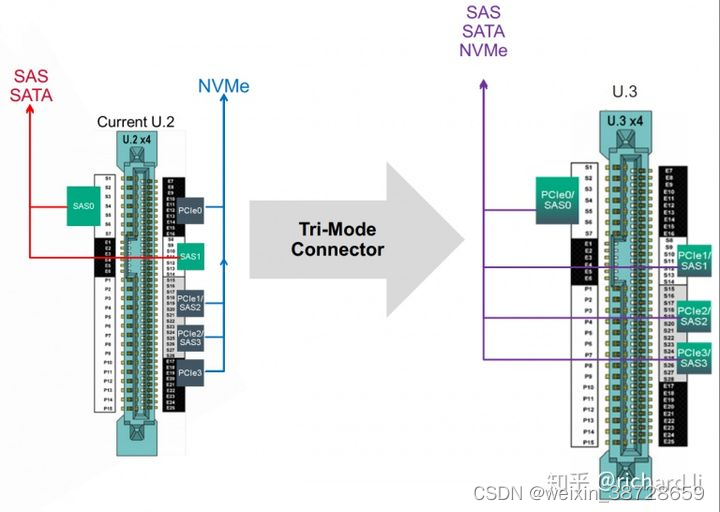 U.3 与U.2 接口形态一致,区别在于: U.2的SATA/SAS与NVMe使用不同的高速引脚。U.3的SAS/SATA与NVMe共用高速引脚。U.3主要是为了上行连接到支持Tri-mode的控制器,如Broadcom的ROC与IOC. 如下图: