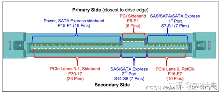 下图为U.2 连接器功能示意图,图中可看到,连接器包含了SATA,SAS和PCIe X4的通道。