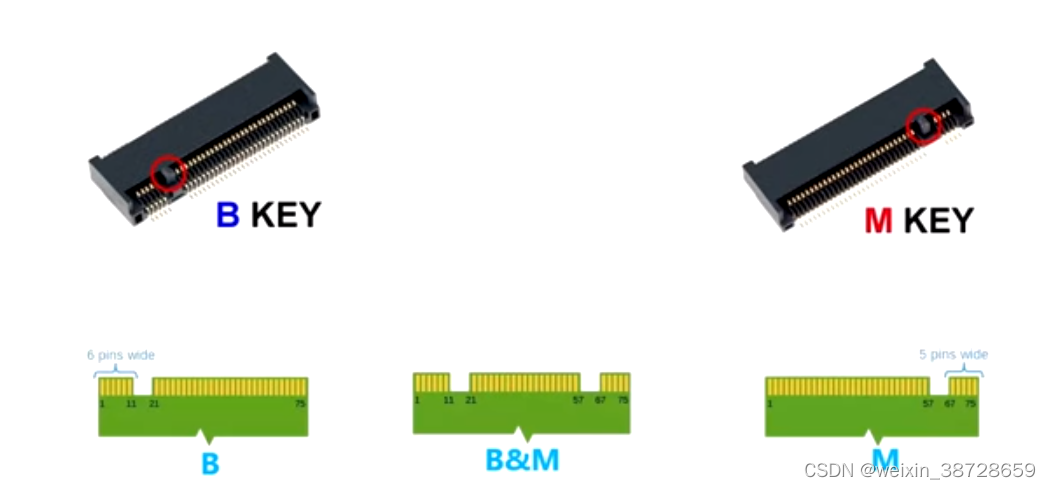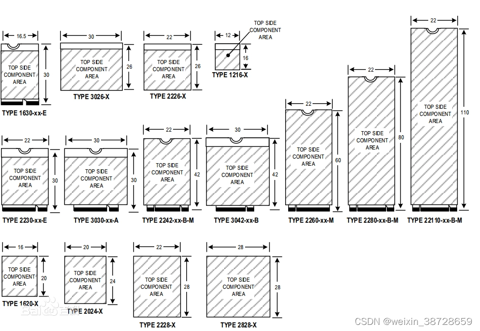 M.2 接口支持了各种协议,通过不同的key槽来支持不同的协议,也定义不同的外形尺寸。下图中列出了M.2接口的尺寸规格。