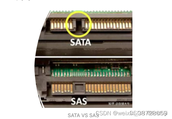 SATA/SAS外观如下图,SAS比SATA多了一个凹槽,背面是6个PIN, 是E1~E6, 相较于SATA,由于多了这6PIN, SAS硬盘支持双向全双工模式,提供了两路通道。
