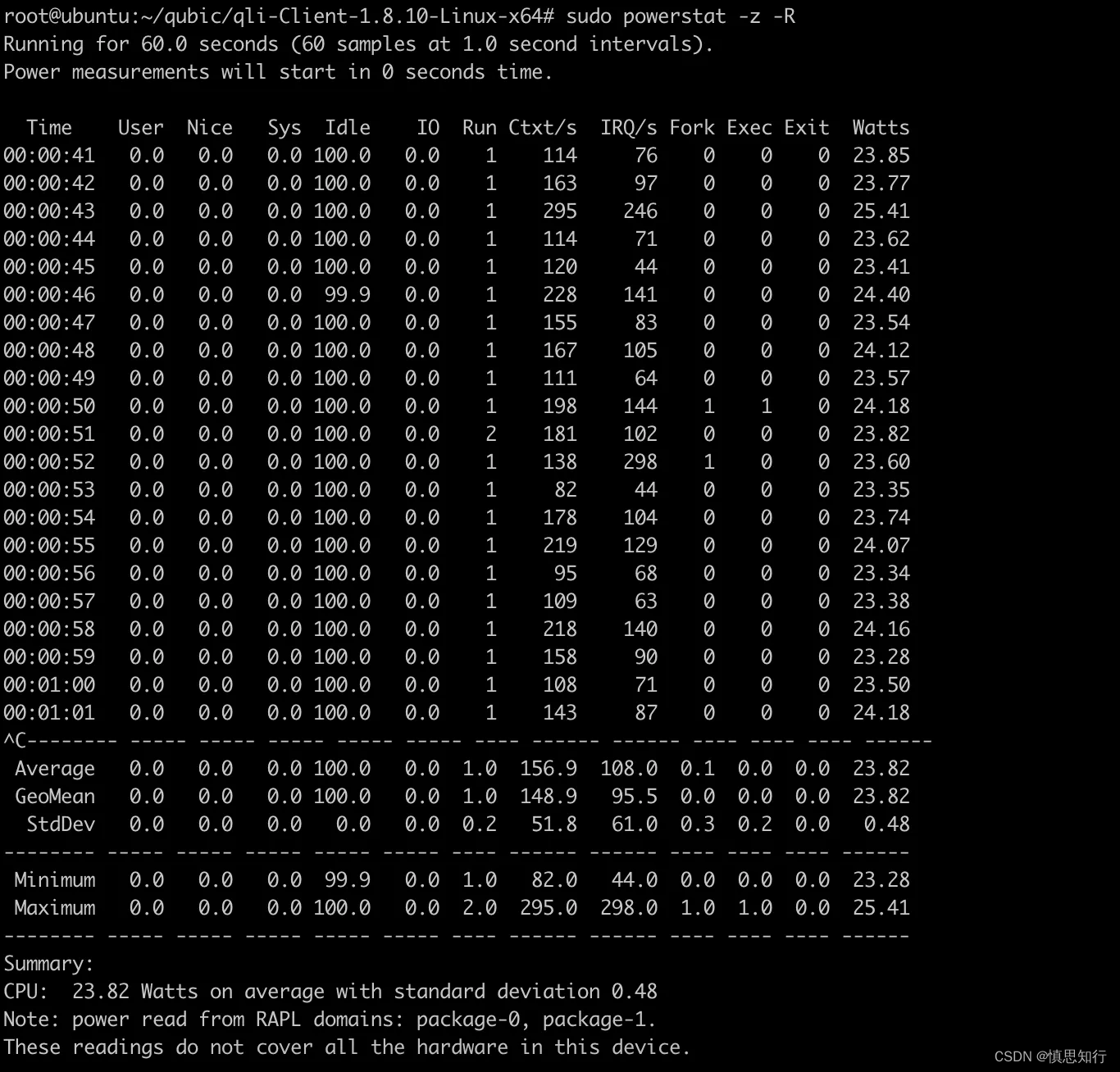 sudo powerstat -z 2.使用 -R 选项:这个选项让 powerstat 使用 Running Average Power Limit (RAPL) 接口来估计功耗。RAPL 是一种在Intel处理器上提供功耗和能量使用信息的方法。
