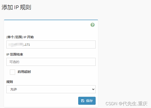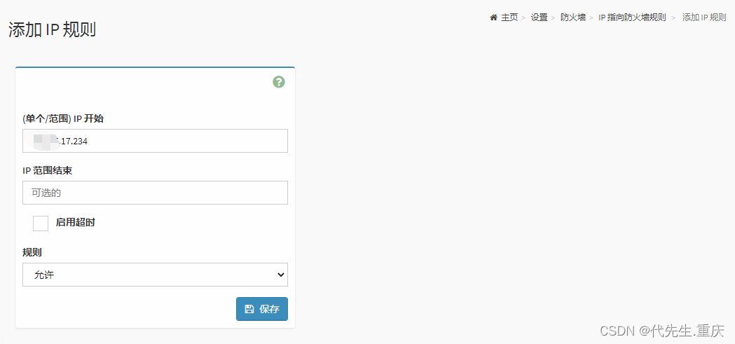 首先需要将当前登录的远程可信维护主机加入到白名单中,防止启用白名单后连接中断无法配置,点击IP地址防火墙规则,添加IP规则,添加主机IP,单个IP只需添加到IP开始中即可,规则选定为“允许”,如下图所示: