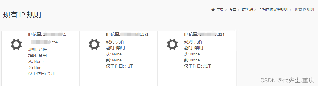 点击右上“系统防火墙”页签返回到防火墙页面,点击“IP地址防火墙”--“现有IP规则”,可以看到当前已配置的全部白名单: