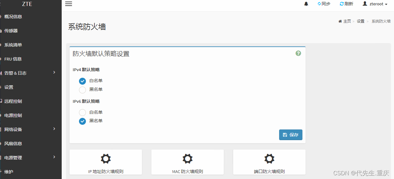 中兴R5300 G4服务器启用了BMC远程管理,为保障设备安全配置启用防火墙只放通特定维护服务器可以访问。