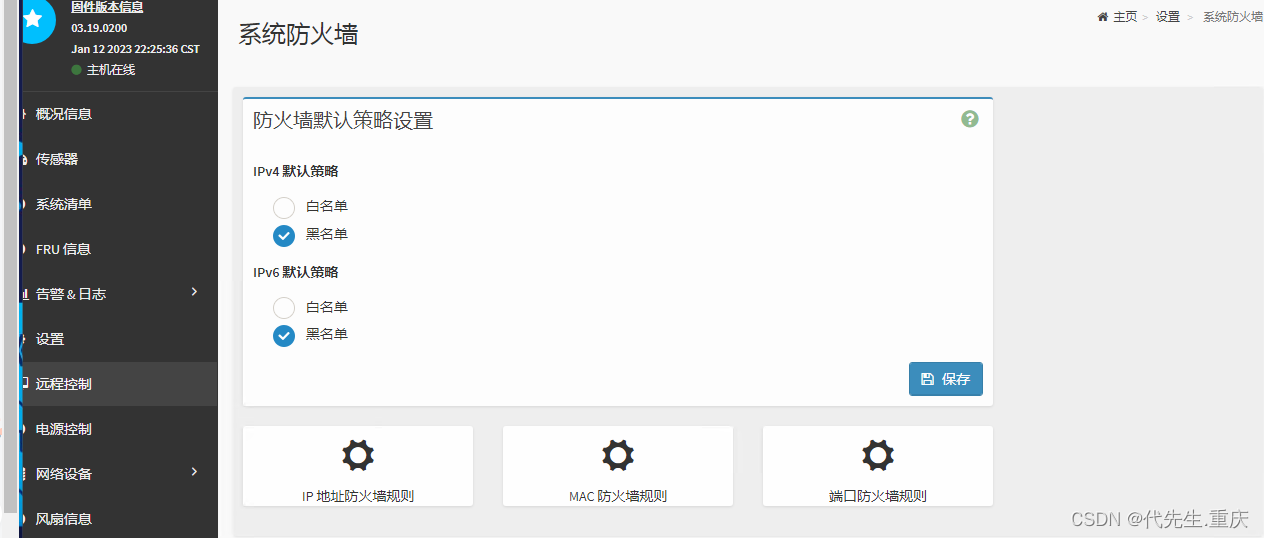 在系统防火墙页签,将ipv4默认策略由黑名单调整为白名单,点击保存,此时将只有白名单列表中的主机可以访问设备BMC地址了