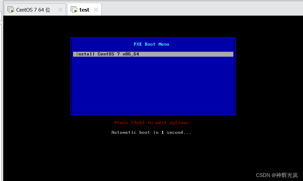 [root@pxe ~]# ./pxe2.sh mount: /dev/sr0 写保护,将以只读方式挂载 已完成创建部署目录,按回车继续... 已创建本地yum源配置文件,按回车继续... 已加载插件:fastestmirror 正在清理软件源: centos Cleaning up everything 已加载插件:fastestmirror centos | 3.6 kB 00:00:00 (1/2): centos/group_gz | 155 kB 00:00:00 (2/2): centos/primary_db | 2.8 MB 00:00:00 Determining fastest mirrors 源标识 源名称 状态 centos centos 3,723 repolist: 3,723 已检查源,按回车继续... 已配置网络接口,按回车继续... 已启动并启用网络接口,按回车继续... 已将主机名修改为 'pxe',按回车继续... 已加载插件:fastestmirror Loading mirror speeds from cached hostfile No packages marked for update 已更新系统软件包,按回车继续... 已关闭防火墙,按回车继续... 已加载插件:fastestmirror Loading mirror speeds from cached hostfile 正在解决依赖关系 --> 正在检查事务 ---> 软件包 dhcp.x86_64.12.4.2.5-42.el7.centos 将被 安装 ---> 软件包 httpd.x86_64.0.2.4.6-40.el7.centos 将被 安装 --> 正在处理依赖关系 httpd-tools = 2.4.6-40.el7.centos,它被软件包 httpd-2.4.6-40.el7.centos.x86_64 需要 --> 正在处理依赖关系 /etc/mime.types,它被软件包 httpd-2.4.6-40.el7.centos.x86_64 需要 --> 正在处理依赖关系 libaprutil-1.so.0()(64bit),它被软件包 httpd-2.4.6-40.el7.centos.x86_64 需要 --> 正在处理依赖关系 libapr-1.so.0()(64bit),它被软件包 httpd-2.4.6-40.el7.centos.x86_64 需要 ---> 软件包 syslinux.x86_64.0.4.05-12.el7 将被 安装 --> 正在处理依赖关系 mtools,它被软件包 syslinux-4.05-12.el7.x86_64 需要 ---> 软件包 tftp-server.x86_64.0.5.2-12.el7 将被 安装 --> 正在检查事务 ---> 软件包 apr.x86_64.0.1.4.8-3.el7 将被 安装 ---> 软件包 apr-util.x86_64.0.1.5.2-6.el7 将被 安装 ---> 软件包 httpd-tools.x86_64.0.2.4.6-40.el7.centos 将被 安装 ---> 软件包 mailcap.noarch.0.2.1.41-2.el7 将被 安装 ---> 软件包 mtools.x86_64.0.4.0.18-5.el7 将被 安装 --> 解决依赖关系完成 依赖关系解决 ================================================================================================================ Package 架构 版本 源 大小 ================================================================================================================ 正在安装: dhcp x86_64 12:4.2.5-42.el7.centos centos 511 k httpd x86_64 2.4.6-40.el7.centos centos 2.7 M syslinux x86_64 4.05-12.el7 centos 990 k tftp-server x86_64 5.2-12.el7 centos 44 k 为依赖而安装: apr x86_64 1.4.8-3.el7 centos 103 k apr-util x86_64 1.5.2-6.el7 centos 92 k httpd-tools x86_64 2.4.6-40.el7.centos centos 82 k mailcap noarch 2.1.41-2.el7 centos 31 k mtools x86_64 4.0.18-5.el7 centos 203 k 事务概要 ================================================================================================================ 安装 4 软件包 (+5 依赖软件包) 总下载量:4.7 M 安装大小:14 M Downloading packages: ---------------------------------------------------------------------------------------------------------------- 总计 15 MB/s | 4.7 MB 00:00:00 Running transaction check Running transaction test Transaction test succeeded Running transaction 正在安装 : apr-1.4.8-3.el7.x86_64 1/9 正在安装 : apr-util-1.5.2-6.el7.x86_64 2/9 正在安装 : httpd-tools-2.4.6-40.el7.centos.x86_64 3/9 正在安装 : mtools-4.0.18-5.el7.x86_64 4/9 正在安装 : mailcap-2.1.41-2.el7.noarch 5/9 正在安装 : httpd-2.4.6-40.el7.centos.x86_64 6/9 正在安装 : syslinux-4.05-12.el7.x86_64 7/9 正在安装 : 12:dhcp-4.2.5-42.el7.centos.x86_64 8/9 正在安装 : tftp-server-5.2-12.el7.x86_64 9/9 验证中 : httpd-2.4.6-40.el7.centos.x86_64 1/9 验证中 : httpd-tools-2.4.6-40.el7.centos.x86_64 2/9 验证中 : apr-1.4.8-3.el7.x86_64 3/9 验证中 : mailcap-2.1.41-2.el7.noarch 4/9 验证中 : apr-util-1.5.2-6.el7.x86_64 5/9 验证中 : tftp-server-5.2-12.el7.x86_64 6/9 验证中 : mtools-4.0.18-5.el7.x86_64 7/9 验证中 : 12:dhcp-4.2.5-42.el7.centos.x86_64 8/9 验证中 : syslinux-4.05-12.el7.x86_64 9/9 已安装: dhcp.x86_64 12:4.2.5-42.el7.centos httpd.x86_64 0:2.4.6-40.el7.centos syslinux.x86_64 0:4.05-12.el7 tftp-server.x86_64 0:5.2-12.el7 作为依赖被安装: apr.x86_64 0:1.4.8-3.el7 apr-util.x86_64 0:1.5.2-6.el7 httpd-tools.x86_64 0:2.4.6-40.el7.centos mailcap.noarch 0:2.1.41-2.el7 mtools.x86_64 0:4.0.18-5.el7 完毕! 已安装所需软件包,按回车继续... 已卸载光盘,按回车继续... 已配置DHCP服务器,按回车继续... Created symlink from /etc/systemd/system/multi-user.target.wants/dhcpd.service to /usr/lib/systemd/system/dhcpd.service. 已启动并启用DHCP服务器,按回车继续... mount: /dev/loop0 写保护,将以只读方式挂载 已配置TFTP服务器并编写ks.cfg,文件按回车继续... 已创建PXE引导配置文件,按回车继续... mount: /dev/loop0 写保护,将以只读方式挂载 已配置HTTP服务器,按回车继续... Created symlink from /etc/systemd/system/multi-user.target.wants/httpd.service to /usr/lib/systemd/system/httpd.service. 已启动并启用HTTP服务器,按回车继续... PXE 服务部署完成! [root@pxe ~]# 到此,我们母机完全配置完毕了。其实非常简单,但是因为怕初学者不理解出错,所以说了不少有的没的。