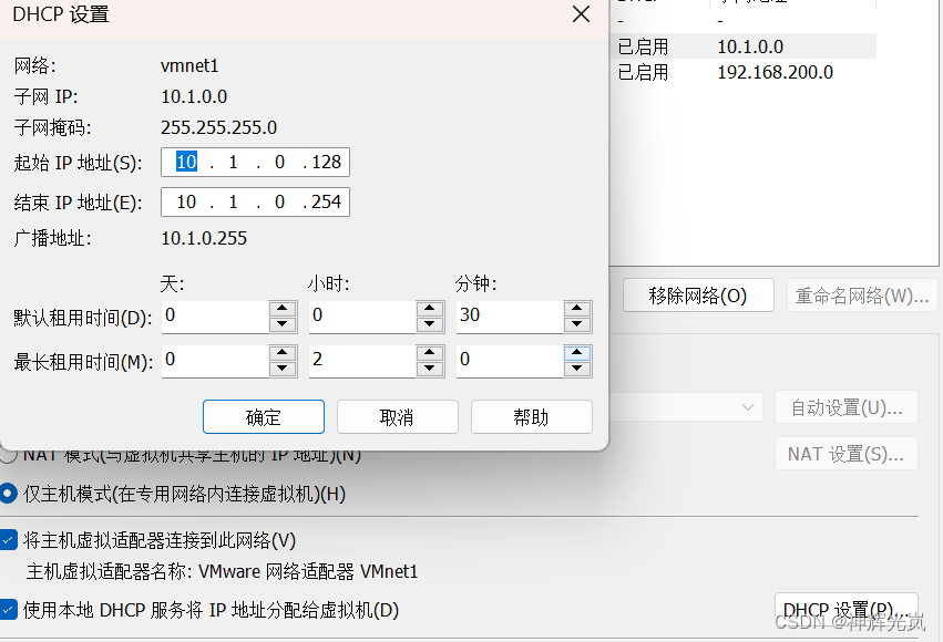 仔细回想一下我一开始母机的ip地址是用dhcp自动分配的,当时给的是128。相信我说到这里有人已经知道原因了,那就是被我们的vm虚拟机给限制了。在虚拟网络编辑器中将我们对应网段的主机模式网卡的使用本地dhcp地址分配虚拟机选项给勾掉就好了。