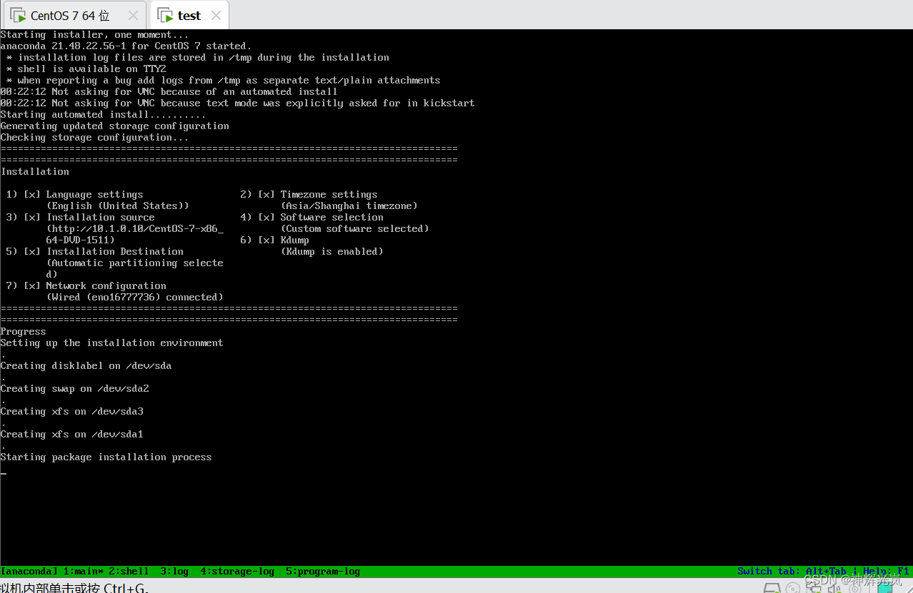 这期间全程摆烂不用动,可以看着它一步一步自己配置好。我这份脚本的代码下面给的参数是以文本行形式安装,因此整个安装过程都看不到之前安装系统的那种图形化界面。如果喜欢图形化界面就自己将脚本代码那部分内容参数修改一下。
