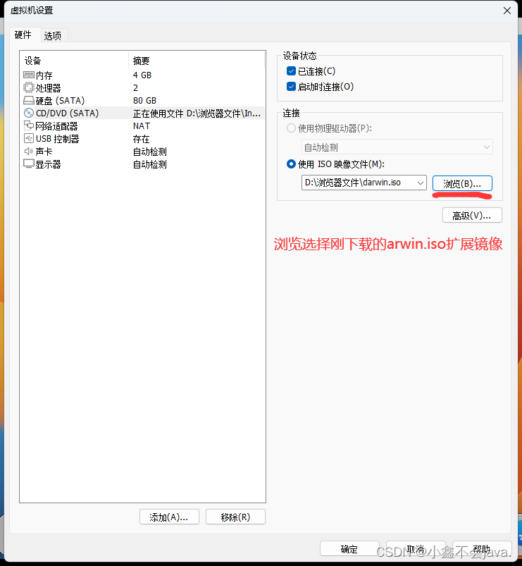 虚拟机 -> 设置 -> CD/DVD(SATA) -> 使用ISO映像文件 -> 浏览