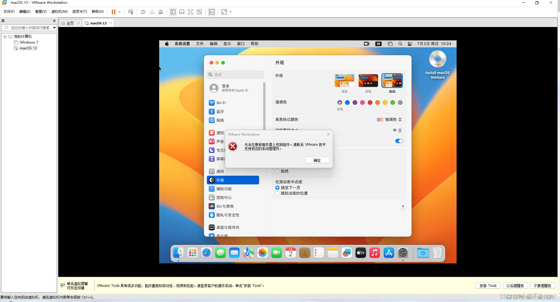 VMware Workstation安装mac OS系统后,安装VMware Tools提示:无法在更新服务器上找到组件。请联系 VMware 技术支持或您的系统管理员的解决方案