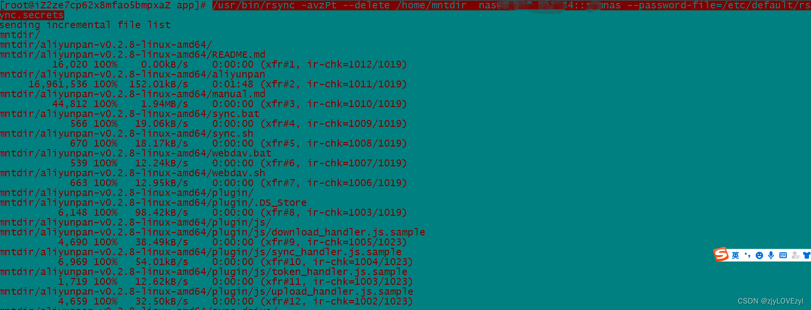 /usr/bin/rsync -avzPt --delete /home/mntdir nas@1.127.121.184::nas --password-file=/etc/default/rsync.secrets