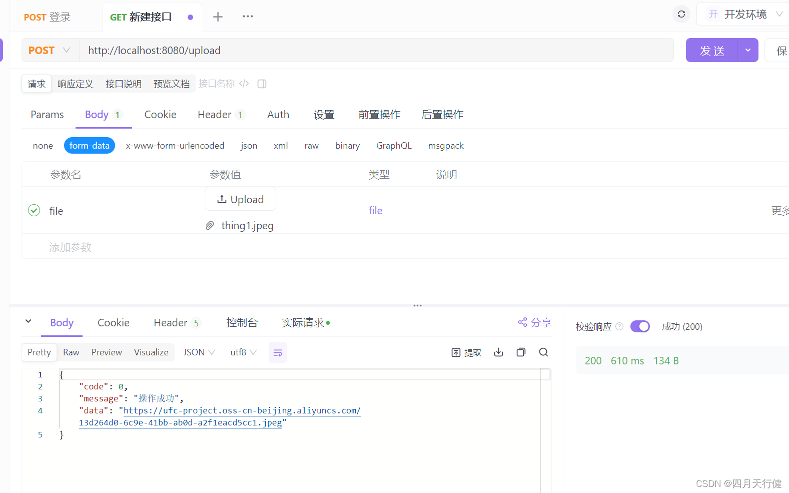 @RestController public class FileUploadController { @PostMapping("/upload") public Result upload(MultipartFile file) throws Exception { String originalFilename = file.getOriginalFilename(); //保证文件名字唯一,防止文件覆盖 String filename = UUID.randomUUID().toString()+originalFilename.substring(originalFilename.lastIndexOf(".")); String url = AliOssUtil.uploadFile(filename,file.getInputStream()); return Result.success(url); } } 这里使用apifox进行测试