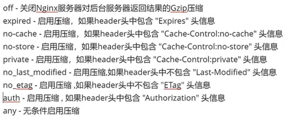 gzip on; # 开启(默认关闭) gzip_min_length 1k; # 最小压缩限值,建议 1KB gzip_comp_level 2; # 压缩等级1-9,动态设置考虑性能比 gzip_min_length 1kb; # 最小压缩启动值 gzip_buffers 4 16k; # 默认,无需配置 gzip_http_version 1.1; # 默认 1.1,无需配置 gzip_types text/plain application/javascript application/x-javascript text/javascript text/css application/xml text/html; # 压缩类型 gzip_vary on; # header标识:告知浏览器使用 gzip 压缩 gzip_disable "MSIE [1-6]\."; # 排除旧版本浏览器,支持正则表达式 gzip_proxied expired no-cache no-store private auth; # 反向代理时设置 gzip_proxied:作为反向代理时使用,表示是否对服务端返回的结果进行 gzip 压缩,参数表示浏览器作出相应表示时才启动。