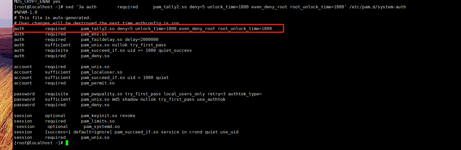 sed -i '3a auth required pam_tally2.so deny=5 unlock_time=1800 even_deny_root root_unlock_time=1800' /etc/pam.d/system-auth