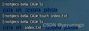 在生成证书请求文件之前,需要形成记录数据的文件index.txt以及最初始的自签名证书的序列号可serial文件: