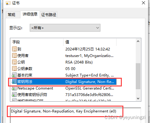 这个证书用途的体现在:当使用证书浏览器查看时看到的密钥用法,如通过浏览器---internet选项---内容---证书---详细信息中显示的: