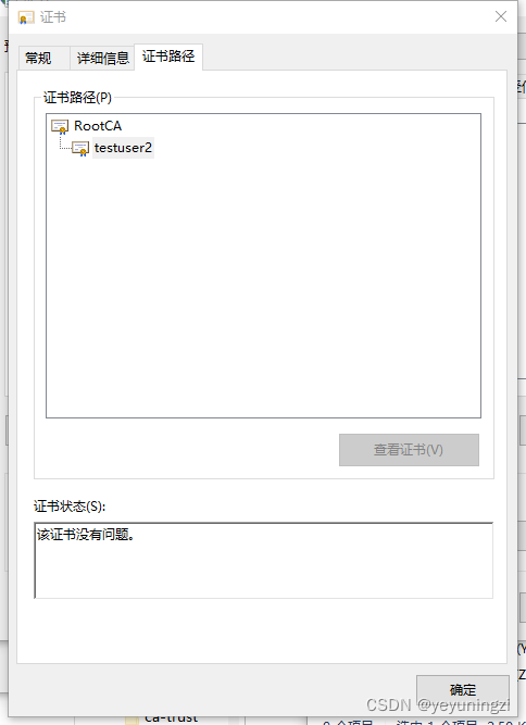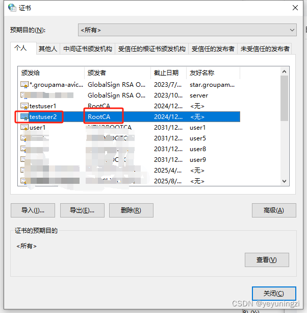 将生成的pfx文件testuser2.pfx、根证书文件caroot.crt通过windows客户端安装检查最终结果如下: