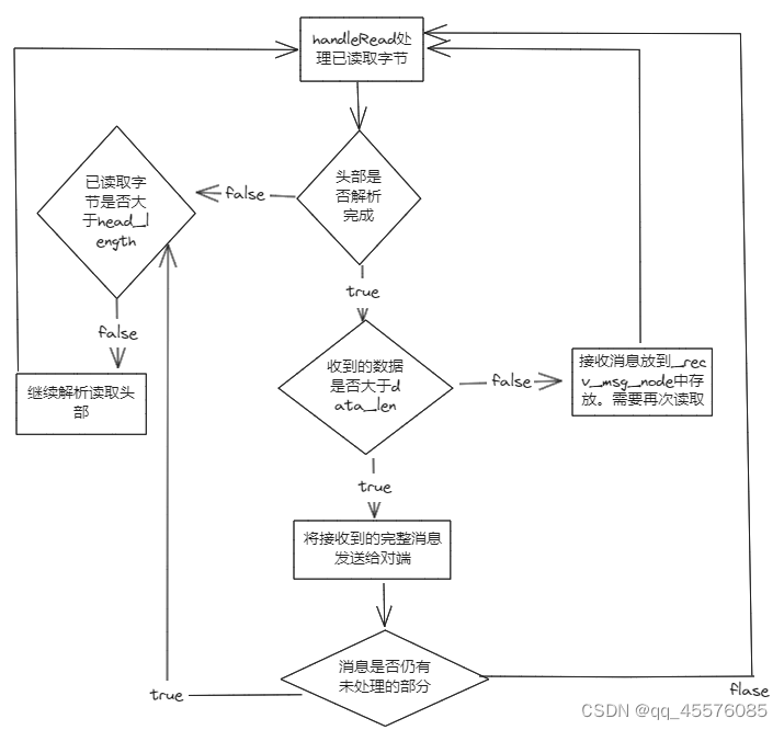 void Session::handle_read(const boost::system::error_code& ec, size_t bytes_transferred, std::shared_ptr self_shared) { if (ec) { std::cout << "read error, error code: " << ec.value() << " read message: " << ec.message() << std::endl; Close(); server_->ClearSession(uuid); } else { PrintRecvData(data_, bytes_transferred); std::chrono::milliseconds dura(2000); std::this_thread::sleep_for(dura); //已经移动的字节数 int copy_len = 0; while (bytes_transferred) { //头部尚未解析完成 if (!_b_head_parse) { //收到的数据不足头部大小,这种情况很少发生 if (bytes_transferred + _recv_head_node->cur_len < HEAD_LENGTH) { memcpy(_recv_head_node->_data + _recv_head_node->cur_len, data_ + copy_len, bytes_transferred); _recv_head_node->cur_len += bytes_transferred; memset(data_, 0, MAX_LENGTH); sock_.async_read_some(boost::asio::buffer(data_, MAX_LENGTH), std::bind(&Session::handle_read, this, std::placeholders::_1, std::placeholders::_2, self_shared)); return; } //走到这里,说明收到的数据大于头部,可能是一个粘连的数据包,但是首先需要将头部节点两字节读完 //处理头部剩余未复制的长度 int head_remain = HEAD_LENGTH - _recv_head_node->cur_len; if (head_remain) { memcpy(_recv_head_node->_data + _recv_head_node->cur_len, data_ + copy_len, head_remain); //更新已处理的数据 copy_len += head_remain; /* * 这里不能更新头部节点的cur_len。 * 因为 * 1、当一次进来cur_len等于0,处理之后的偏移量copy_len就为2 * 2、当头部未读取完成,后续读取会修正为正确的偏移量(但是种情况很少发生) * 3、之后的读取头部信息都会发生覆盖 */ //_recv_head_node->cur_len += head_remain; bytes_transferred -= head_remain; } //获取头部数据 short data_len = 0; memcpy(&data_len, _recv_head_node->_data, HEAD_LENGTH); std::cout << "data_len is " << data_len << std::endl; if (data_len > MAX_LENGTH) { std::cout << "invalid data length is " << data_len << std::endl; server_->ClearSession(uuid); return; } //头部节点处理完成,就可以开始处理数据域的数据节点 _recv_msg_node = std::make_shared(data_len); //消息长度小于头部规定长度,说明数据未收全,则先将消息放到接收节点中 if (bytes_transferred < data_len) { memcpy(_recv_msg_node->_data + _recv_msg_node->cur_len, data_ + copy_len, bytes_transferred); _recv_msg_node->cur_len += bytes_transferred; memset(data_, 0, MAX_LENGTH); sock_.async_read_some(boost::asio::buffer(data_, MAX_LENGTH), std::bind(&Session::handle_read, this, std::placeholders::_1, std::placeholders::_2, self_shared)); //表示头部处理完成,当下次进来的时候,就会直接跳过头部处理环节 _b_head_parse = true; return; } //走到这里表示消息长度大于头部规定长度,这里可能是一个完整包,也可能是多个粘连的包 memcpy(_recv_msg_node->_data + _recv_msg_node->cur_len, data_ + copy_len, data_len); _recv_msg_node->cur_len += data_len; copy_len += data_len; bytes_transferred -= data_len; _recv_msg_node->_data[_recv_msg_node->total_len] = '\0'; std::cout << "receive data is: " << _recv_msg_node->_data << std::endl; //调用send发送给客户端 Send(_recv_msg_node->_data, _recv_msg_node->total_len); //继续轮询处理下个未处理的数据,重置数据包和头部解析的情况 _b_head_parse = false; _recv_msg_node->Clear(); //说明这不是一个多个粘连的数据包 if (bytes_transferred <= 0) { memset(data_, 0, MAX_LENGTH); sock_.async_read_some(boost::asio::buffer(data_, MAX_LENGTH), std::bind(&Session::handle_read, this, std::placeholders::_1, std::placeholders::_2, self_shared)); return; } //走到这里说明这就是一个多个粘连的数据包 continue; } //走到这里就说明头部是已经解析完成的,是处理数据未收全的情况 int remain_msg = _recv_msg_node->total_len - _recv_msg_node->cur_len; //说明收到的数据仍然不足头部规定大小的情况 if (bytes_transferred < remain_msg) { memcpy(_recv_msg_node->_data + _recv_msg_node->cur_len, data_ + copy_len, bytes_transferred); _recv_msg_node->cur_len += bytes_transferred; memset(data_, 0, MAX_LENGTH); sock_.async_read_some(boost::asio::buffer(data_, MAX_LENGTH), std::bind(&Session::handle_read, this, std::placeholders::_1, std::placeholders::_2, self_shared)); return; } //走到这里说明收到的数据是大于等于头部规定大小的,接收到的数据可能是个完整的数据包,也可能多个粘连的数据包 memcpy(_recv_msg_node->_data + _recv_msg_node->cur_len, data_ + copy_len, remain_msg); _recv_msg_node->cur_len += remain_msg; bytes_transferred -= remain_msg; copy_len += remain_msg; _recv_msg_node->_data[_recv_msg_node->total_len] = '\0'; std::cout << "receive data is: " << _recv_msg_node->_data << std::endl; //处理完当前数据包的分割后,调用send接口向客户端发送回去 Send(_recv_msg_node->_data, _recv_msg_node->total_len); //继续轮询处理下个数据包,重置接收数据节点和头部解析情况 _b_head_parse = false; _recv_msg_node->Clear(); //说明数据包并不是粘连的 if (bytes_transferred <= 0) { memset(data_, 0, MAX_LENGTH); sock_.async_read_some(boost::asio::buffer(data_, MAX_LENGTH), std::bind(&Session::handle_read, this, std::placeholders::_1, std::placeholders::_2, self_shared)); return; } //走到这里说明数据包是粘连的 continue; } } } 这里hand_read函数的完善逻辑代码比较长,其中的注释给的比较详细,需要各位仔细读。但是逻辑可能头一两次读可能还是会有些蒙,多读几遍可能就会好得多。