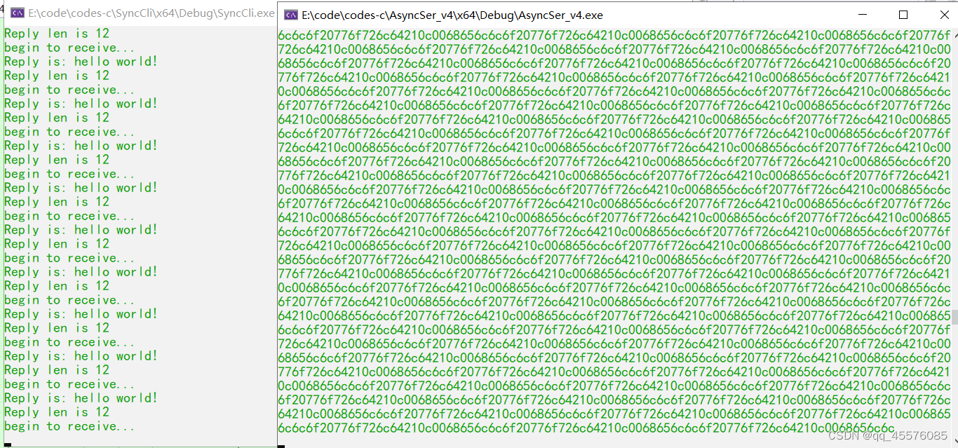 #include #include #include using namespace std; using namespace boost::asio::ip; const int MAX_LENGTH = 1024 * 2; const int HEAD_LENGTH = 2; int main() { //测试粘包现象客户端 try { //创建上下文服务 boost::asio::io_context ioc; //构造endpoint tcp::endpoint remote_ep(address::from_string("127.0.0.1"), 1234); tcp::socket sock(ioc); boost::system::error_code error = boost::asio::error::host_not_found; sock.connect(remote_ep, error); if (error) { cout << "connect failed, code is " << error.value() << " error msg is " << error.message(); return 0; } thread send_thread([&sock] { for (;;) { this_thread::sleep_for(std::chrono::milliseconds(2)); const char* request = "hello world!"; size_t request_length = strlen(request); char send_data[MAX_LENGTH] = { 0 }; memcpy(send_data, &request_length, 2); memcpy(send_data + 2, request, request_length); boost::asio::write(sock, boost::asio::buffer(send_data, request_length + 2)); } }); thread recv_thread([&sock] { for (;;) { this_thread::sleep_for(std::chrono::milliseconds(2)); cout << "begin to receive..." << endl; char reply_head[HEAD_LENGTH]; size_t reply_length = boost::asio::read(sock, boost::asio::buffer(reply_head, HEAD_LENGTH)); short msglen = 0; memcpy(&msglen, reply_head, HEAD_LENGTH); char msg[MAX_LENGTH] = { 0 }; size_t msg_length = boost::asio::read(sock, boost::asio::buffer(msg, msglen)); std::cout << "Reply is: "; std::cout.write(msg, msglen) << endl; std::cout << "Reply len is " << msglen; std::cout << "\n"; } }); send_thread.join(); recv_thread.join(); } catch (std::exception& e) { std::cerr << "Exception: " << e.what() << endl; } return 0; } 现象如下图,测试环境Windows visual studio