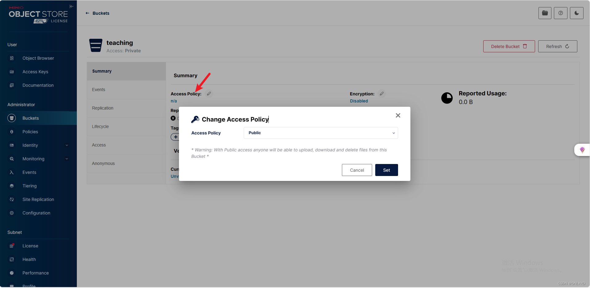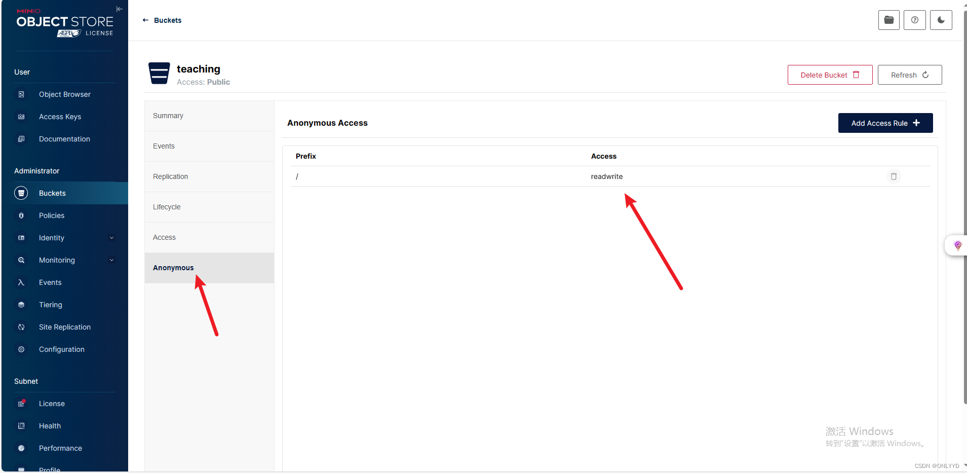 进入teaching,点击Access Policy设置成public,点击Anonymous 设置下图可读写
