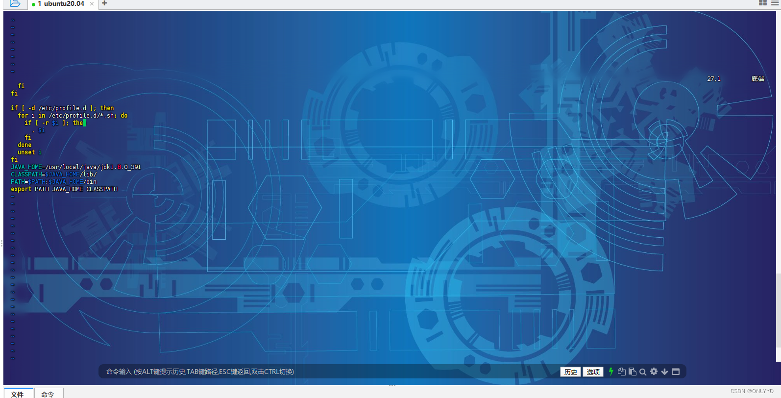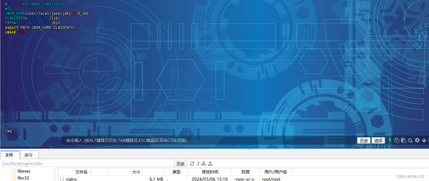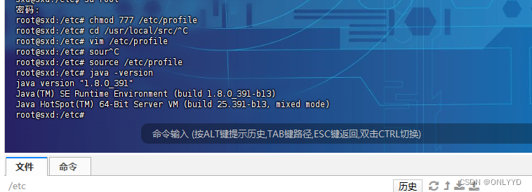 #解压jdk tar -zxvf jdk-8u391-linux-x64.tar.gz #配置环境变量 chmod 777 /etc/profile vim /etc/profile 在最后一行输入以下内容