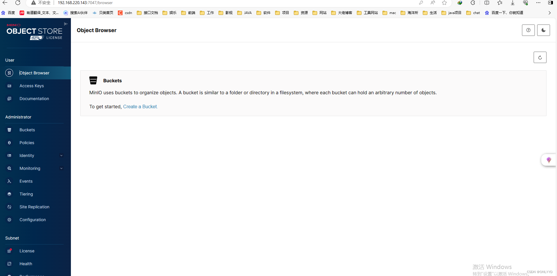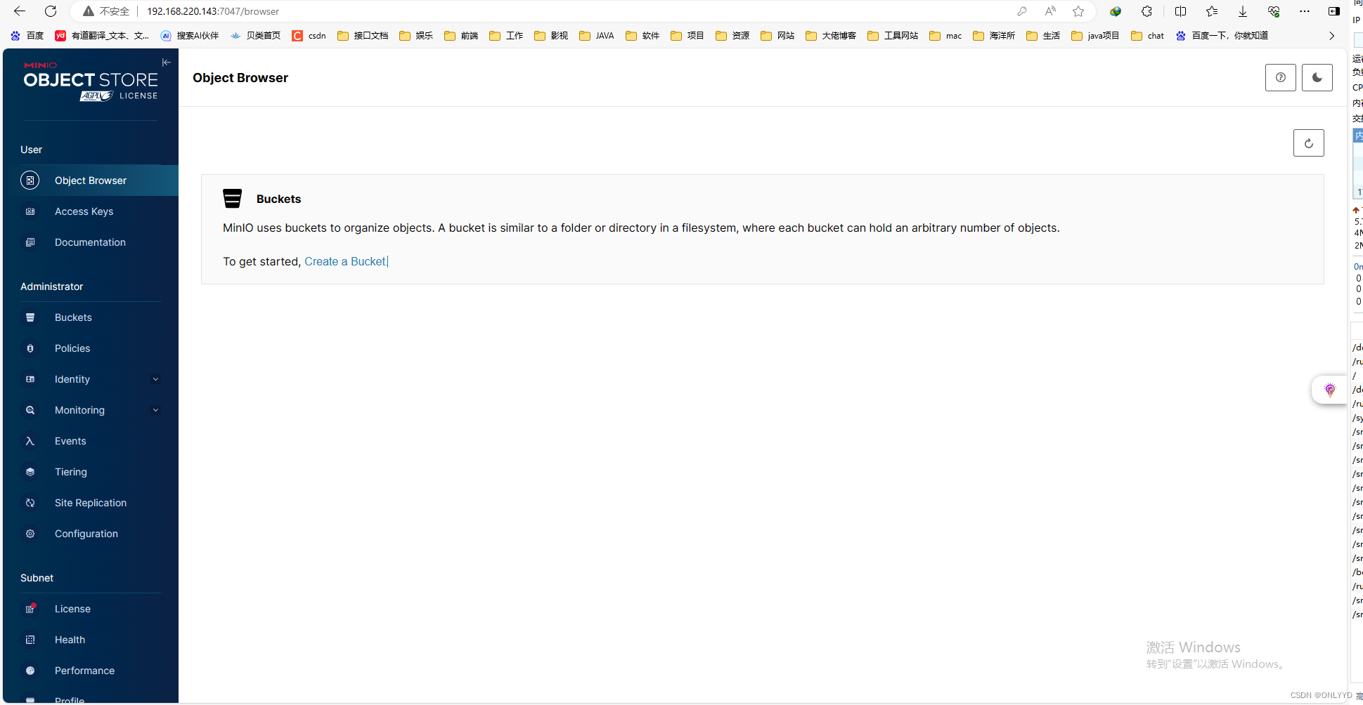 # 创建minio应用程序目录 mkdir -p /usr/local/minio/bin # 创建minio数据目录 mkdir -p /usr/local/minio/data # 创建minio日志目录 mkdir -p /usr/local/minio/logs #将软件下载 cd /usr/local/minio/bin # 下载服务端 wget https://dl.min.io/server/minio/release/linux-amd64/minio # 将下载所得minio文件拷贝到指定文件夹并赋权 sudo chmod +x /usr/local/minio/bin/minio 测试执行minio MINIO_ROOT_USER=myname MINIO_ROOT_PASSWORD=mypassword nohup /usr/local/minio/bin/minio server /usr/local/minio/data --console-address ":7047" --address ":7048" > /usr/local/minio/logs/minio.log 2>&1 & sudo minio server /usr/local/minio/data --console-address ":7047" --address ":7048" > /usr/local/minio/logs/minio.log 2>&1 &