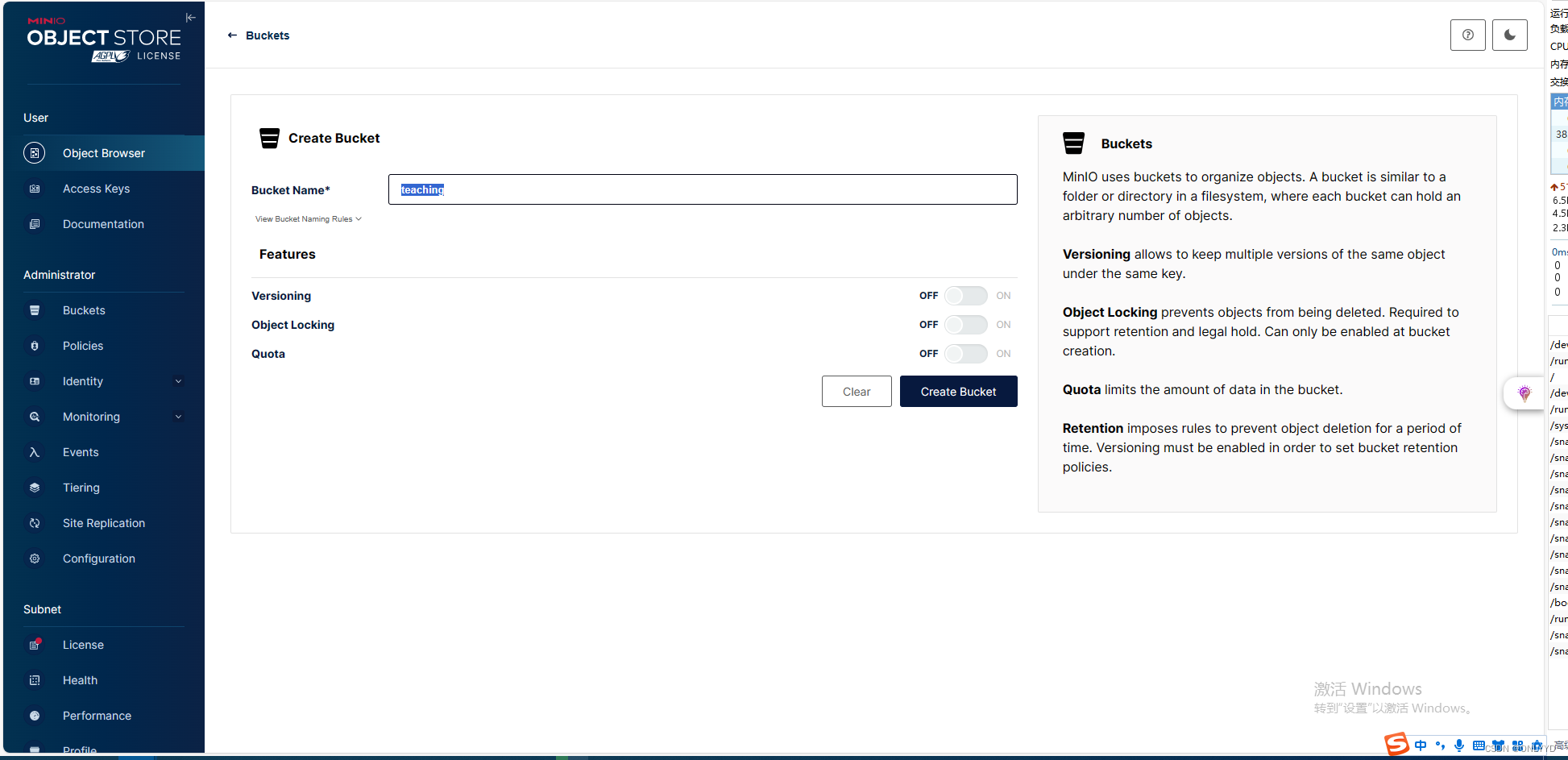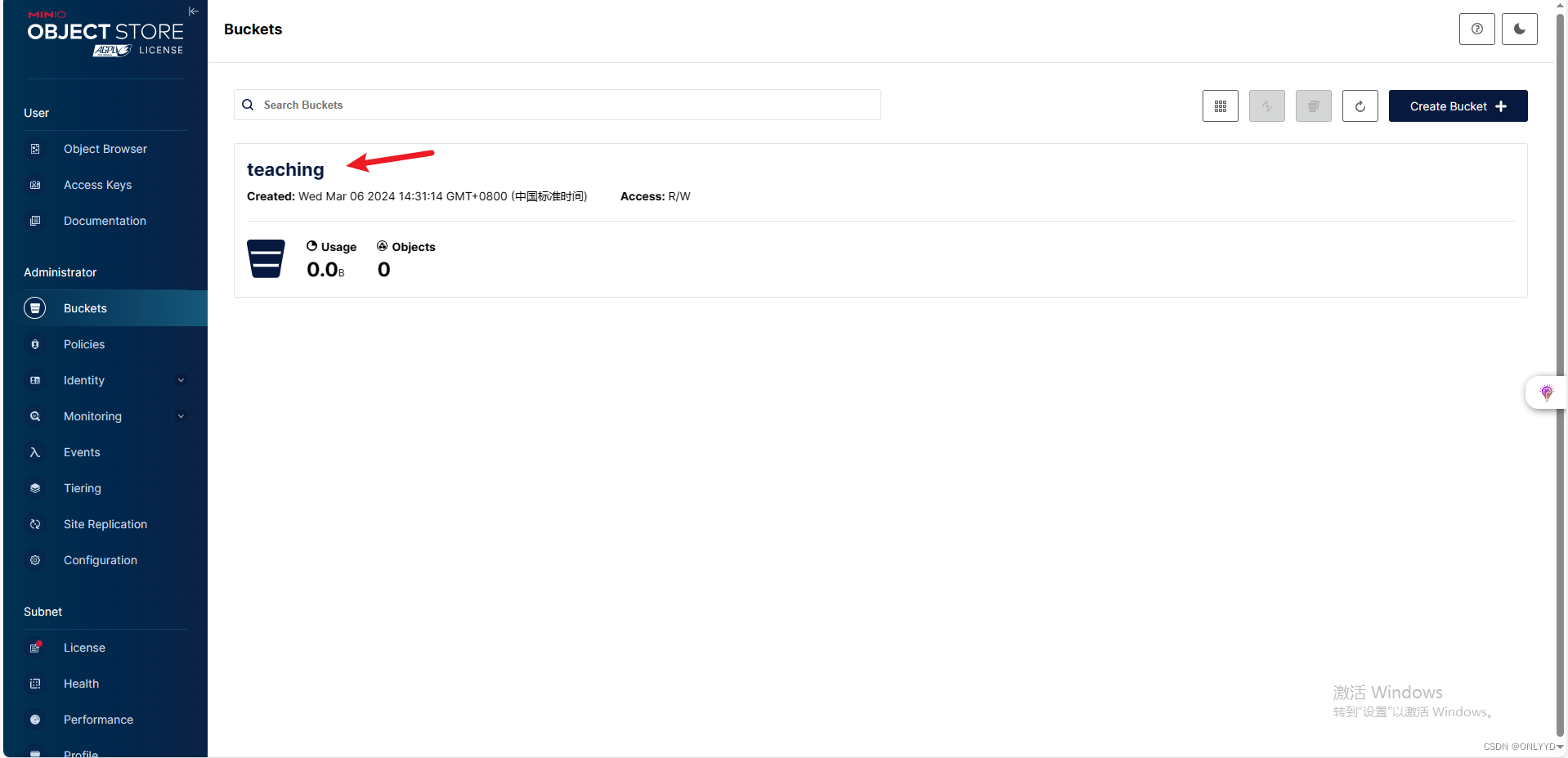 点击Create Bucket并输入teaching