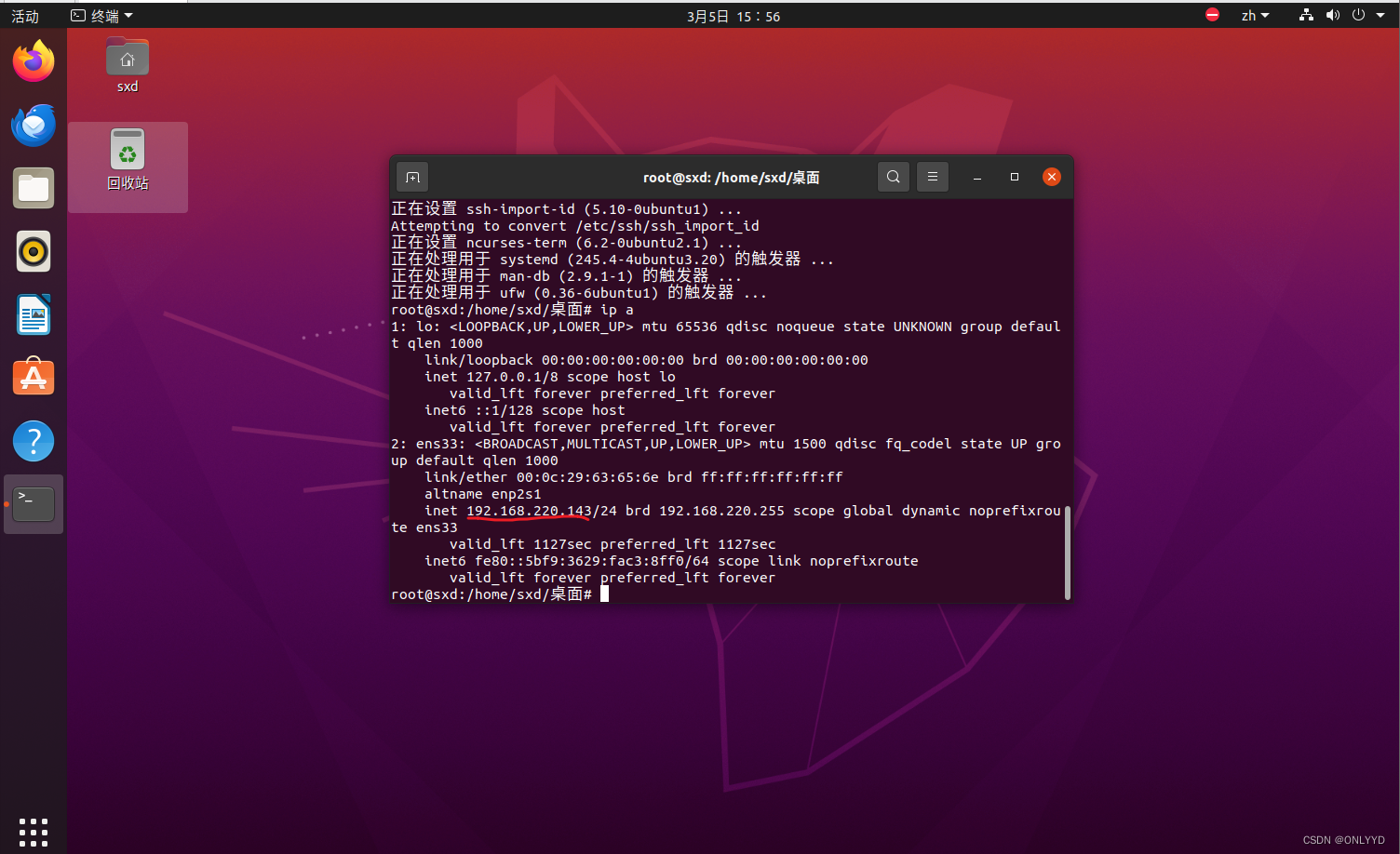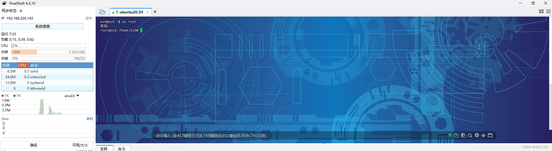 安装ssh后可通过ssh软件连接服务器,首先获取自身ip为192.168.220.143