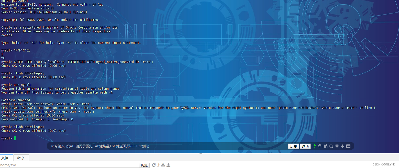 ALTER USER 'root'@'localhost' IDENTIFIED WITH mysql_native_password BY 'root'; flush privileges; #更改root连接权限 use mysql; update user set host='%' where user = 'root'; flush privileges;