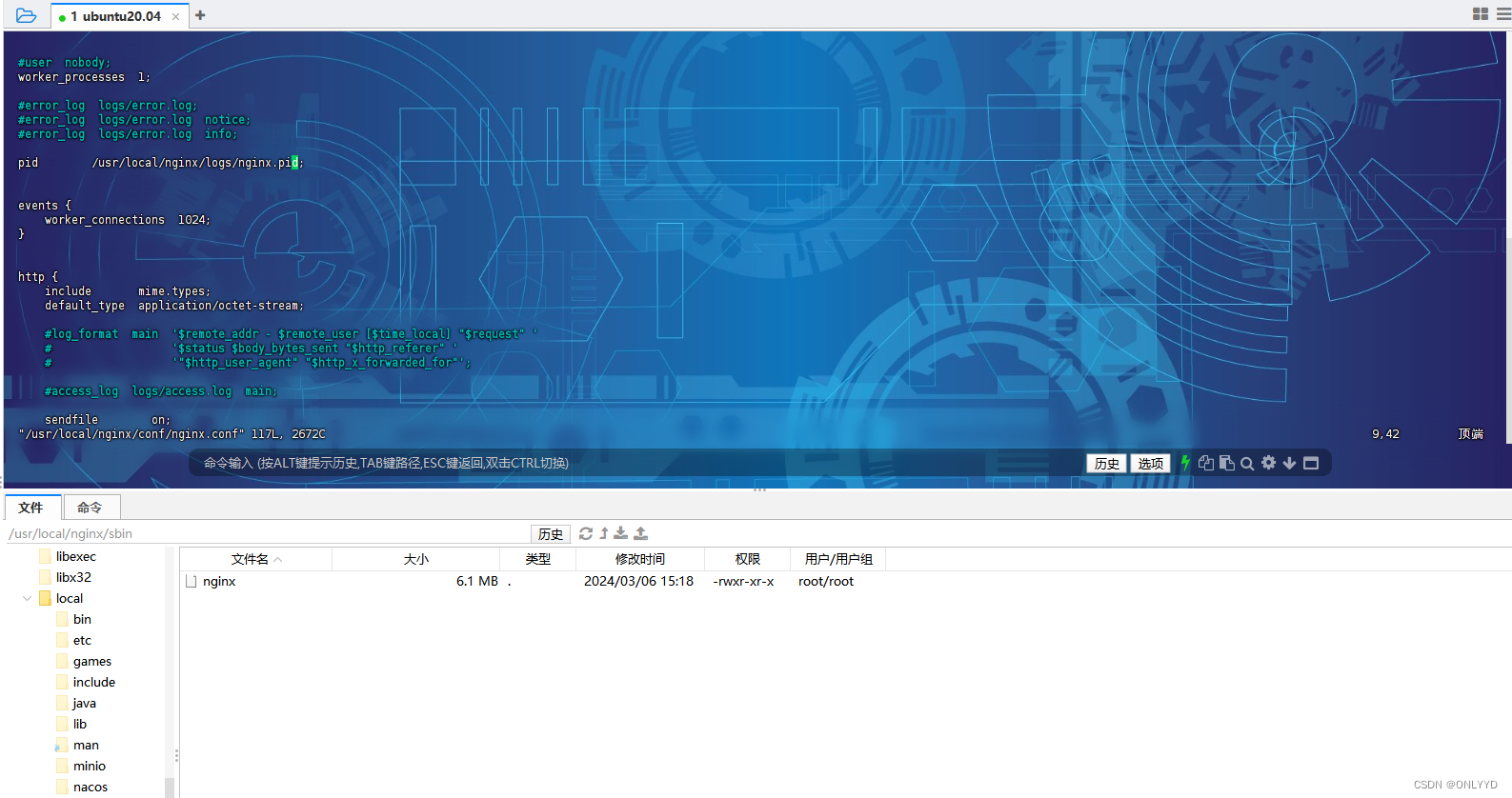 cd /usr/local #安装编译用的组件包 sudo apt-get install libxml2-dev build-essential openssl libssl-dev make curl libcurl4-gnutls-dev libjpeg-dev libpng-dev libtool-bin bison zlib1g-dev libpcre3 libpcre3-dev libssl-dev libxslt1-dev libgeoip-dev libgoogle-perftools-dev libperl-dev libtool #从远程下载文件 c #解压文件到 /usr/local 目录 tar -xvf nginx-1.20.1.tar.gz -C /usr/local cd /usr/local/nginx-1.20.1 #进入目录并执行命令 sudo ./configure \ --prefix=/usr/local/nginx \ --pid-path=/var/run/nginx/nginx.pid \ --lock-path=/var/lock/nginx.lock \ --error-log-path=/var/log/nginx/error.log \ --http-log-path=/var/log/nginx/access.log \ --with-http_gzip_static_module \ --http-client-body-temp-path=/var/temp/nginx/client \ --http-proxy-temp-path=/var/temp/nginx/proxy \ --http-fastcgi-temp-path=/var/temp/nginx/fastcgi \ --http-uwsgi-temp-path=/var/temp/nginx/uwsgi \ --http-scgi-temp-path=/var/temp/nginx/scgi \--with-http_stub_status_module \--with-http_ssl_module \--with-file-aio \--with-http_realip_module #创建临时目录 mkdir /var/temp/nginx -p #进行编译和安装 cd /usr/local/nginx-1.20.1 sudo make sudo make install #安装结束后可删除nginx-1.20.1 rm -rf /usr/local/nginx-1.20.1 cd /usr/local/nginx #安装后目录为 /usr/local/nginx 创建pid文件