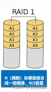 | RAID1(镜像化存储) | 读快,写没有改变 | 偶数 | N/2 | 有,可允许一个硬盘故障 |