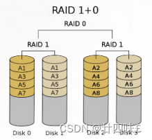 | RAID10 | 同时具备RAID0和RAID1的性能,读写都快 | >=4,偶数 | N/2 | 有,可允许不同RAID1组中各坏一个硬盘 |