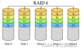 | RAID6 | 读快,写会因为要多写两份纠删码数据而会更影响写的性能 | >=4 | (N-2)/N | 有,可允许两个硬盘故障 |