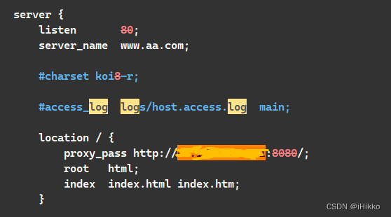 但是我们一个服务器上,可能有很多个域名都绑定了这个服务器的ip,每个域名都是一个独立的网站,而且服务器上可能有很多个后端应用服务,而端口(80)只有一个,那这么多网站和服务怎么公用一个端口呢?没错,还是靠nginx,我们只需要配置多个server即可,多个server都监听80端口,再根据域名的不同将请求转发到不同的端口即可 监听www.aa.com域名的80端口,并转发到8080端口