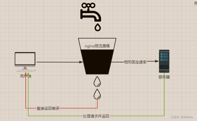 用户端的大量请求(突发流量)会进入nginx内维护的漏桶中,漏桶会按照我们定义的固定的速率给服务器分发请求,正常的请求在服务器处理完后会正常返回给用户端。如果水流过大(突发流量过大)时,漏桶内的水会溢出,这时nginx就把这些溢出的水(流量)直接丢弃,也就是给用户端返回错误信息。
