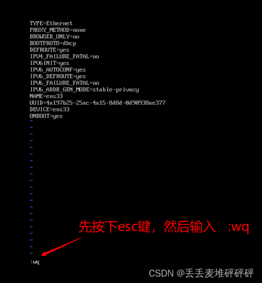 修改完成后,按下esc键,退出编辑模式,按下冒号:然后输入wq,保存退出