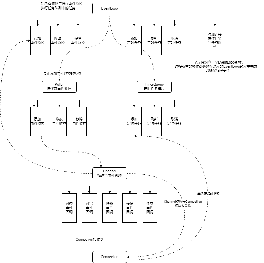 class EventLoop; /*描述符监控事件管理类*/ class Channel { using EventCallback = std::function; public: Channel(EventLoop *loop, int fd) : _loop(loop), _fd(fd), _events(0), _revents(0) {} /*返回文件描述符*/ int Fd() { return _fd; } /*返回被监控的事件*/ uint32_t Events() { return _events; } /*各种回调函数的设置 -- 对应事件被触发后在HandleEvent函数中调用*/ void SetReadCallback(const EventCallback &cb) { _read_cb = cb; } void SetWriteCallback(const EventCallback &cb) { _write_cb = cb; } void SetCloseCallback(const EventCallback &cb) { _close_cb = cb; } void SetEventCallback(const EventCallback &cb) { _event_cb = cb; } void SetErrorCallback(const EventCallback &cb) { _error_cb = cb; } /*启动可读事件监控*/ void EnableRead() { _events |= EPOLLIN; Update(); } /*启动可写事件监控*/ void EnableWrite() { _events |= EPOLLOUT; Update(); } /*判断当前是否监控了可读事件*/ bool Readable() { return (_events & EPOLLIN); } /*判断当前是否监控了可写事件*/ bool Writeable() { return (_events & EPOLLOUT); } /*关闭可读事件监控*/ void DisableRead() { _events &= ~EPOLLIN; Update(); } /*关闭可写事件监控*/ void DisableWrite() { _events &= ~EPOLLOUT; Update(); } /*关闭所有事件监控*/ void DisableEvent() { _events = 0; Update(); } /*移除事件监控*/ /*添加/修改事件监控*/ // 注意:由于我们我们上面只是声明了有EventLoop这个类,并不知道EventLoop里面有哪些函数 // 但是Remove和Update又需要调用EventLoop::RemoveEvent和EventLoop::UpdateEvent // 所以我们需要将它们的实现放到EventLoop类后面,这里仅仅是声明 void Remove(); void Update(); /*设置就绪事件*/ void SetRevents(uint32_t events) { _revents = events; } /*事件处理 -- 事件触发后调用(函数内部通过_revents判断事件类型)*/ void HandleEvent() { // EPOLLIN读事件就绪/EPOLLRDHUP客户端连接半关闭(需要读取缓冲区中可能的剩余数据)/EPOLLPRI存在优先带外数据 if ((_revents & EPOLLIN) || (_revents & EPOLLRDHUP) || (_revents & EPOLLPRI)) { if (_read_cb) _read_cb(); } // 有可能会让连接释放的就绪事件一次只执行一个 // EPOLLOUT写事件就绪 if (_revents & EPOLLOUT) { if (_write_cb) _write_cb(); } // EPOLLHUP客户端连接关闭事件就绪 else if (_revents & EPOLLHUP) { if (_close_cb) _close_cb(); } // EPOLLERR错误事件就绪 else if (_revents & EPOLLERR) { if (_error_cb) _error_cb(); } // 虽然错误事件可能导致连接释放,但由于连接释放操作都是先压入到任务队列中,等待业务处理完毕后才会执行任务队列中的任务 // 即连接真正被释放一定是在就绪事件全部处理完毕后,所以这里可以将event_cb放到最后,这样也保证了连接的活跃度刷新是在业务处理完毕后进行的 if (_event_cb) _event_cb(); } private: int _fd; // 进行监控事件管理的连接(描述符) EventLoop *_loop; // 描述符事件管理与处理句柄 uint32_t _events; // 当前连接需要被监控的事件 uint32_t _revents; // 当前连接已经触发的事件 EventCallback _read_cb; // 可读事件被触发的回调函数 EventCallback _write_cb; // 可写事件被触发的回调函数 EventCallback _close_cb; // 连接断开事件被触发的回调函数 EventCallback _event_cb; // 任意事件被触发的回调函数 EventCallback _error_cb; // 错误事件被触发的回调函数 }; /*Channel::Remove和Channel::Update函数的实现*/ /*移除事件监控*/ void Channel::Remove() { return _loop->RemoveEvent(this); } /*添加/修改事件监控*/ void Channel::Update() { return _loop->UpdateEvent(this); } Poller 模块的设计思想如下: