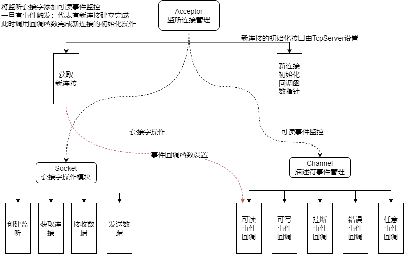 /*LoopThread线程池,用于管理及分配所有的LoopThread*/ class LoopThreadPool { public: LoopThreadPool(EventLoop *main_loop) : _thread_count(0), _loop_idx(0), _main_loop(main_loop) {} /*设置从线程数量*/ void SetThreadCount(uint32_t count) { _thread_count = count; _threads.resize(_thread_count); _loops.resize(_thread_count); } /*创建所有的从属LoopThread线程*/ void CreateThreads() { if (_thread_count == 0) return; for (size_t i = 0; i < _thread_count; i++) { _threads[i] = new LoopThread(); _loops[i] = _threads[i]->GetLoop(); } } /*为通信连接分配EventLoop*/ EventLoop *GetLoop() { // 如果_thread_count为0,即单Reactor模型,则全部连接的全部事件都在主EventLoop中完成 if (_thread_count == 0) return _main_loop; // 如果是主从Reactor模型,则为每个连接分配一个EventLoop,连接的所有事件都在对应的EventLoop中完成 EventLoop *loop = _loops[_loop_idx]; _loop_idx = (_loop_idx + 1) % _thread_count; return loop; } private: uint32_t _thread_count; // 从线程数量 int _loop_idx; // 当前未分配的EventLoop的下标 EventLoop *_main_loop; // 主EventLoop(主Reactor主线程),当从线程数量为0时连接的所有操作都在主线程中执行 std::vector _threads; // 保存所有的从LoopThread std::vector _loops; // 保存所有的EventLoop,当从线程数量大于0时从_threads中为EventLoop分配线程 }; TcpServer 模块的设计思想如下: