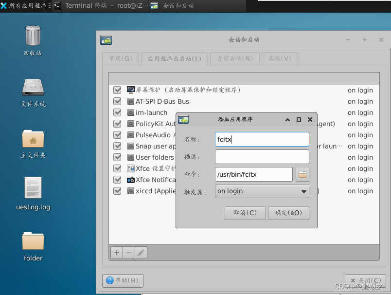 sudo vim /etc/profile “在设置” -> "会话和启动" -> "应用程序自启动"->添加一个启动项(左下角的加号+)