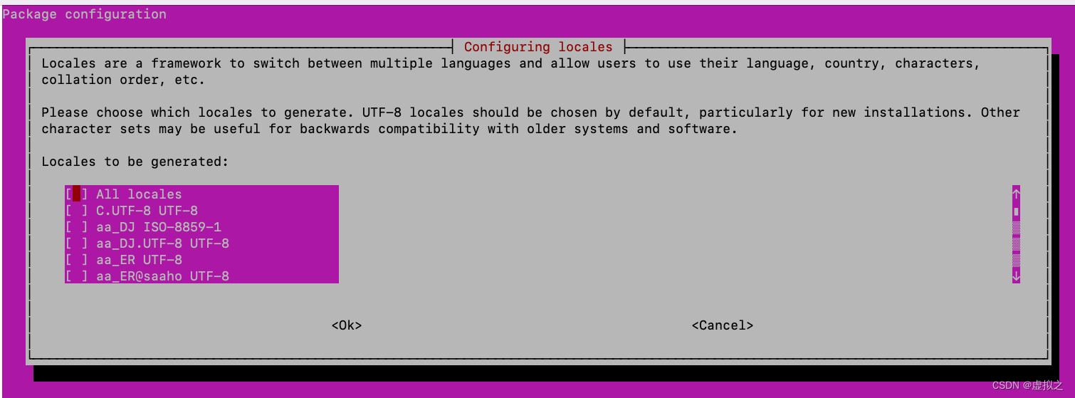 vncserver -kill :1 # 用你实际的显示号替换 ":1" tightvncserver -geometry 1440x900 dpkg-reconfigure locales 选择这些选项(点击空格键选中,点击回车建退出界面)