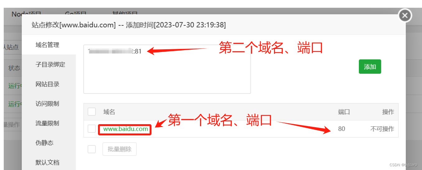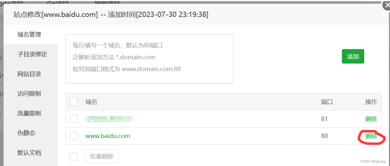 添加完之后,删除第一个域名(刚才随便起了www.baidu.com)