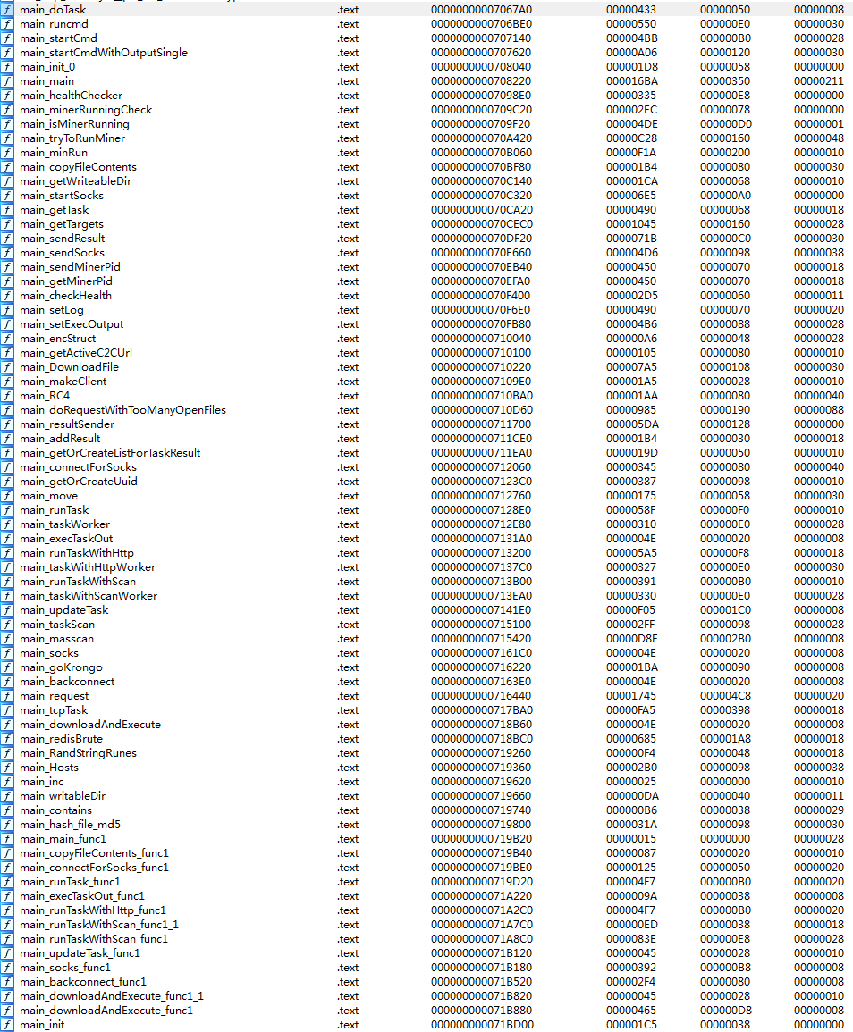 对比发现三个文件其实相同,推测可能是由于重复入侵导致。该程序由GO语言开发,通过还原后的函数名进行对比,可知其是H2Miner此前的kinsing文件变种,并且与http[:]//45.10.88.124/kinsing下载得到的文件一致。