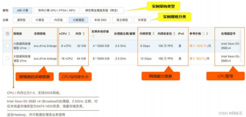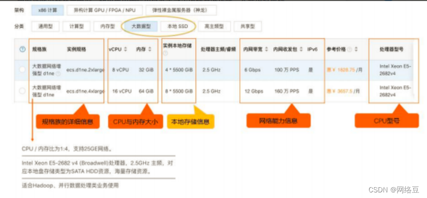 除了共享型的入门级实例以外,阿里云还有两个实例规格比较特殊,就是大数据型和本地 SSD。