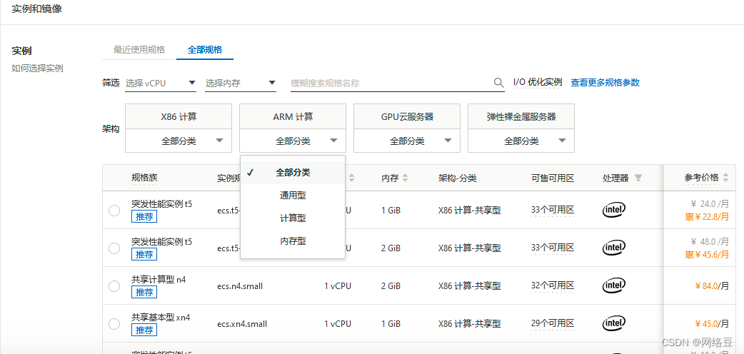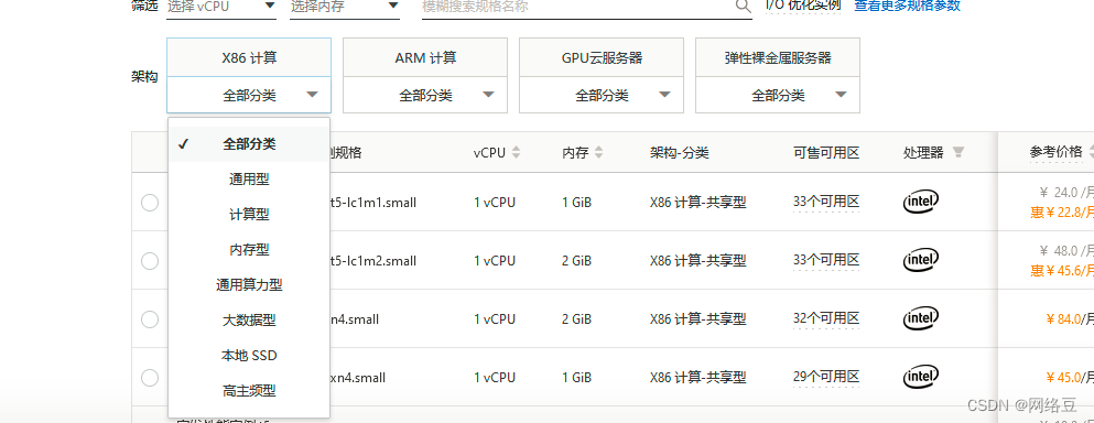 因为入门级实例存在性能不稳定的特性,所以阿里云现在仅仅提供一种入门级实例,就是在 X86 架构中的共享型实例, 而 X86 架构中的其他实例规格,以及异构架构和神龙架构中的所有实例,都是属于企业级实例。