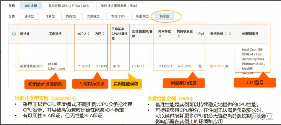 我们前面讲到了只有 X86 架构下的共享型实例才是入门级实例。这类实例比前面实例在四要素以外多出一个参数,即“平均基准的 CPU 计算性能”,基准性能即实例能够持续提供的 CPU 性能。