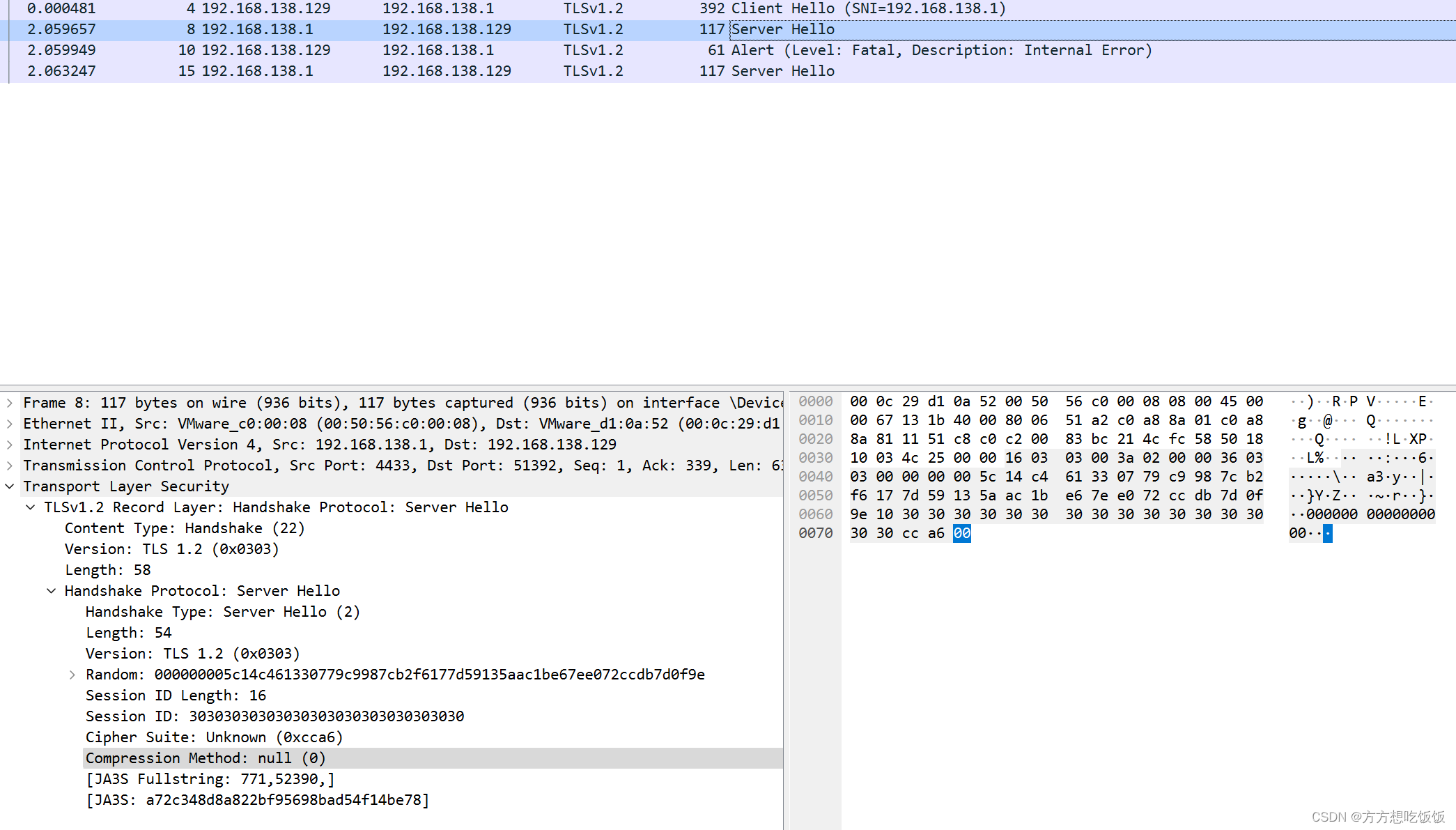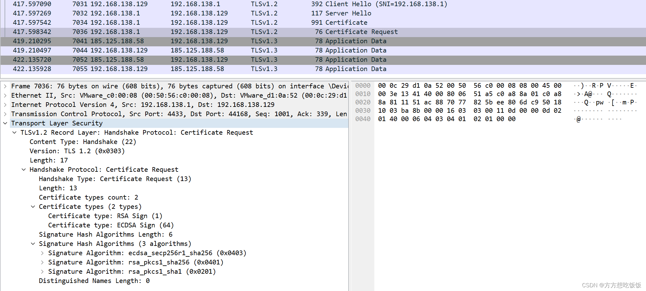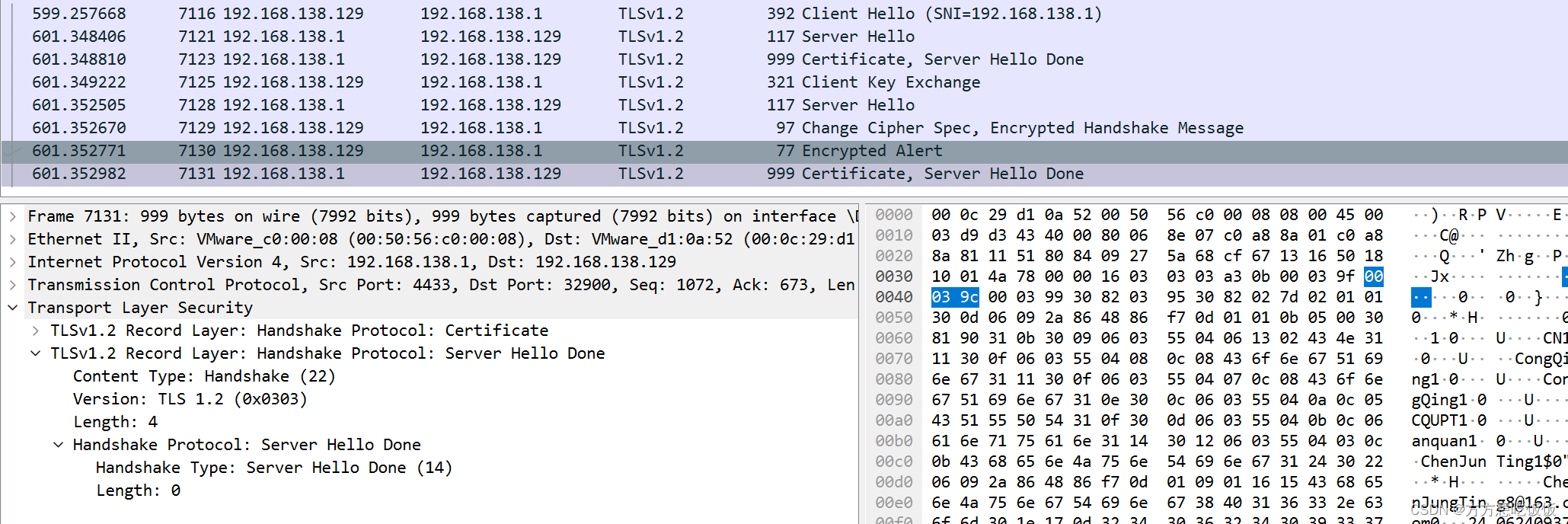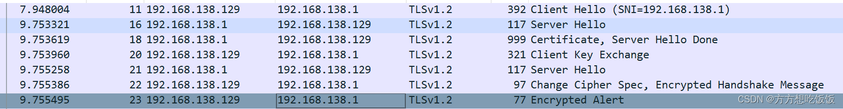 from scapy.all import * from collections import namedtuple from scapy.layers.tls.all import * from scapy.layers.inet import * iface = namedtuple('iface', 'name ip port') ETH_IFACE_A = iface(name='VMware Network Adapter VMnet8', ip='192.168.138.1', port=4233) ETH_IFACE_B = iface(name='VMware Network Adapter VMnet8', ip='192.168.138.129', port=4433) # 创建TLS HelloRequest消息 tls_ClientHello =TLS(type=22,version=0x0303,msg=TLSClientHello(version="TLS 1.2")) tls_ClientHello.show() sip = Ether() / IP(src=ETH_IFACE_A.ip, dst=ETH_IFACE_B.ip) / TCP(sport=ETH_IFACE_A.port, dport=ETH_IFACE_B.port)/tls_ClientHello sendp(sip, iface=ETH_IFACE_A.name) print(sip.build()) 具体可以看以下抓包
