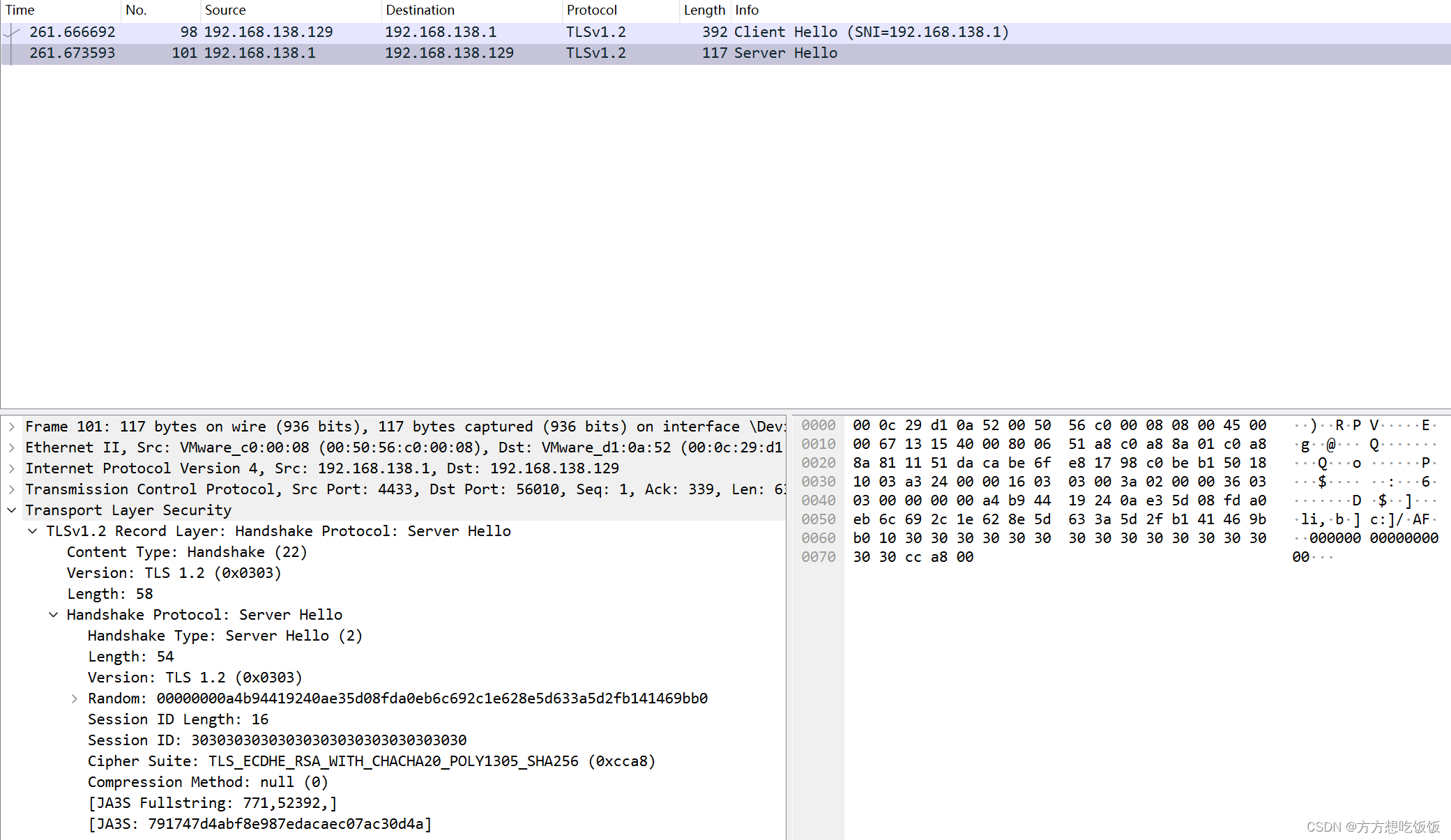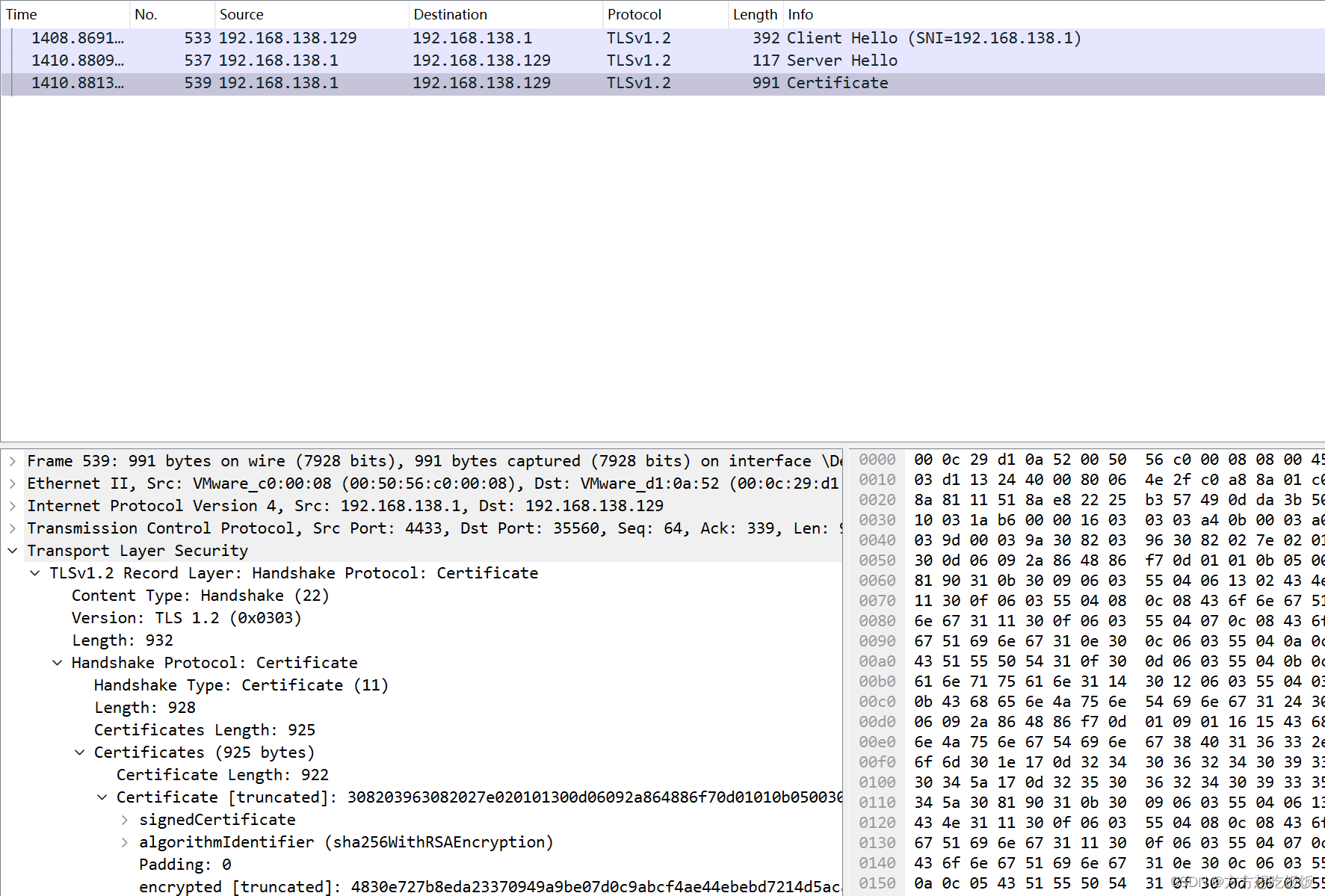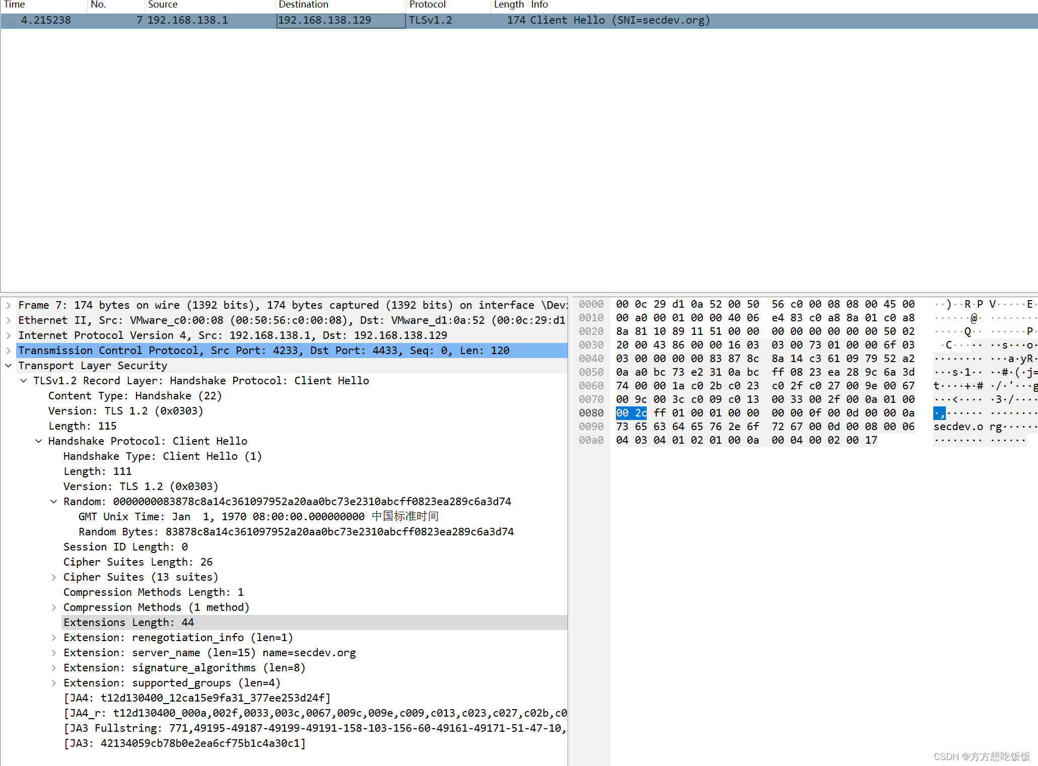 from scapy.all import * from collections import namedtuple from scapy.layers.tls.all import * from scapy.layers.inet import * iface = namedtuple('iface', 'name ip port') ETH_IFACE_A = iface(name='VMware Network Adapter VMnet8', ip='192.168.138.1', port=4233) ETH_IFACE_B = iface(name='VMware Network Adapter VMnet8', ip='192.168.138.129', port=4433) # 创建TLS HelloRequest消息 tls_ClientHello =TLS(type=22,version=0x0303,msg=TLSClientHello(version="TLS 1.2")) tls_ClientHello.show() sip = Ether() / IP(src=ETH_IFACE_A.ip, dst=ETH_IFACE_B.ip) / TCP(sport=ETH_IFACE_A.port, dport=ETH_IFACE_B.port)/tls_ClientHello sendp(sip, iface=ETH_IFACE_A.name) print(sip.build()) 具体可以看以下抓包