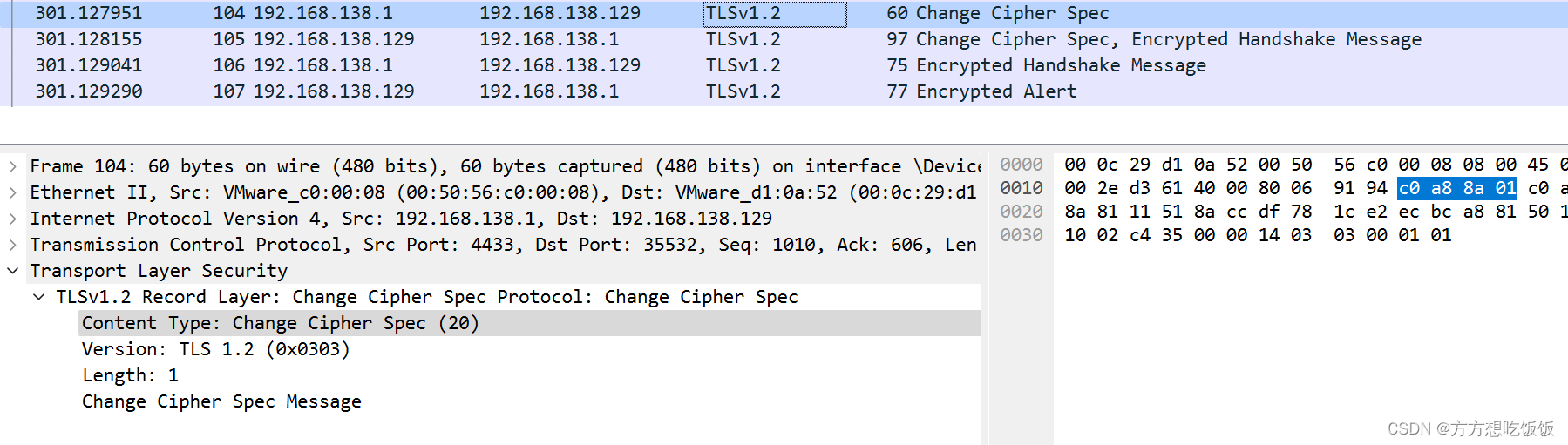 Finished 消息总是在变更密码规范消息之后立即发送,以验证密钥交换和认证过程是否成功。在发送 Finished 消息之前,必须接收到其他握手消息和变更密码规范消息。