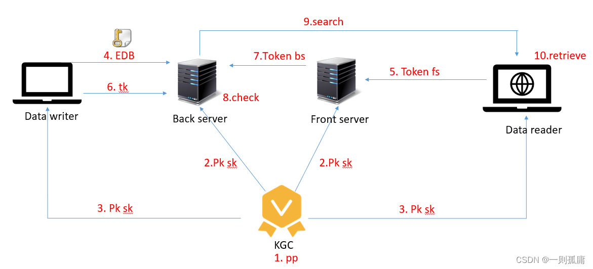 3.数据读取者的查询issue:数据读取者运行陷门生成算法,发布一个布尔查询,生成一个检索陷门(搜索令牌)。数据写入者运行转换密钥生成算法为云生成数据共享的转换密钥。